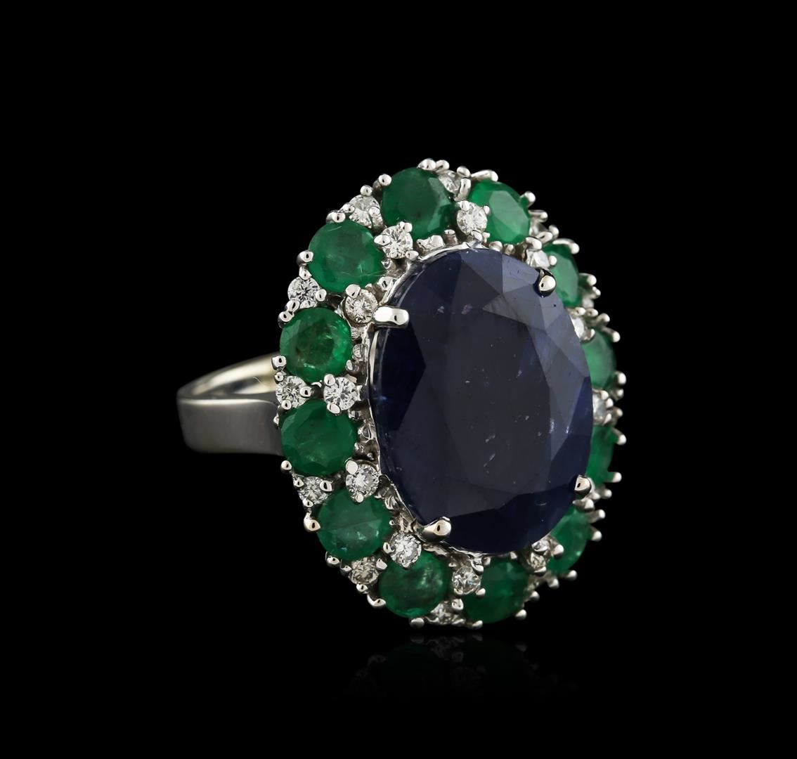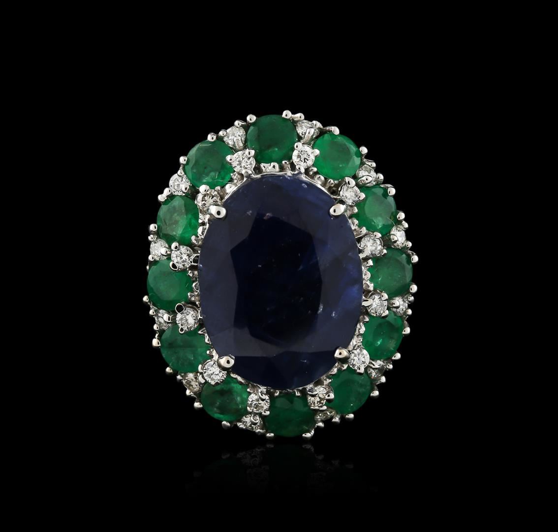 One electronically tested 14KT white gold ladies cast sapphire, emerald and Diamond ring with a cathedral shank with a bright polish finish. Identified with markings of "14K". Condition is new. Containing: One prong set oval modified brilliant cut natural blue sapphire, measuring 17.19 x 13.06 x 6.64mm, approximate weight of 12.52ct., clarity is heavily included, type II, medium dark, very slightly grayish, blue color, (GIA B 6/3), cut is good. Twelve prong set round modified brilliant cut natural emeralds, measuring 4.40 - 4.30 x 2.83 mm, approximate total weight of 3.60ct., clarity is heavily included, type III, medium light, very slightly grayish, green color, (GIA G 4/3), cut is good. Twenty-Four prong set round brilliant cut diamonds, measuring 1.60 - 1.50 x 0.93mm (depth est.) approximate total weight of 24 Stones = 0.33ct. Clarity: SI-1. Color: J - K, Cut is Good. All diamonds and colored gemstones are graded in the mounting, unless otherwise stated. Colored gemstones are presumed to have been subjected to commonly used enhancement processes. Total Weight of Colored Stones 16.12ct. Total Weight of Diamonds 0.33ct. Total Weight of Ring 12.30 grams. GGL Appraised at $3,925.00.