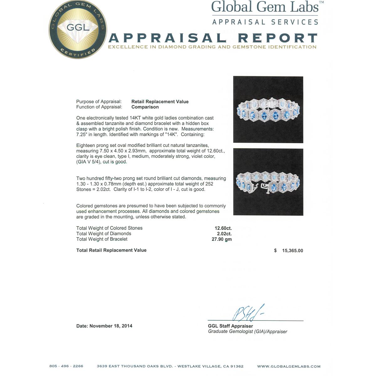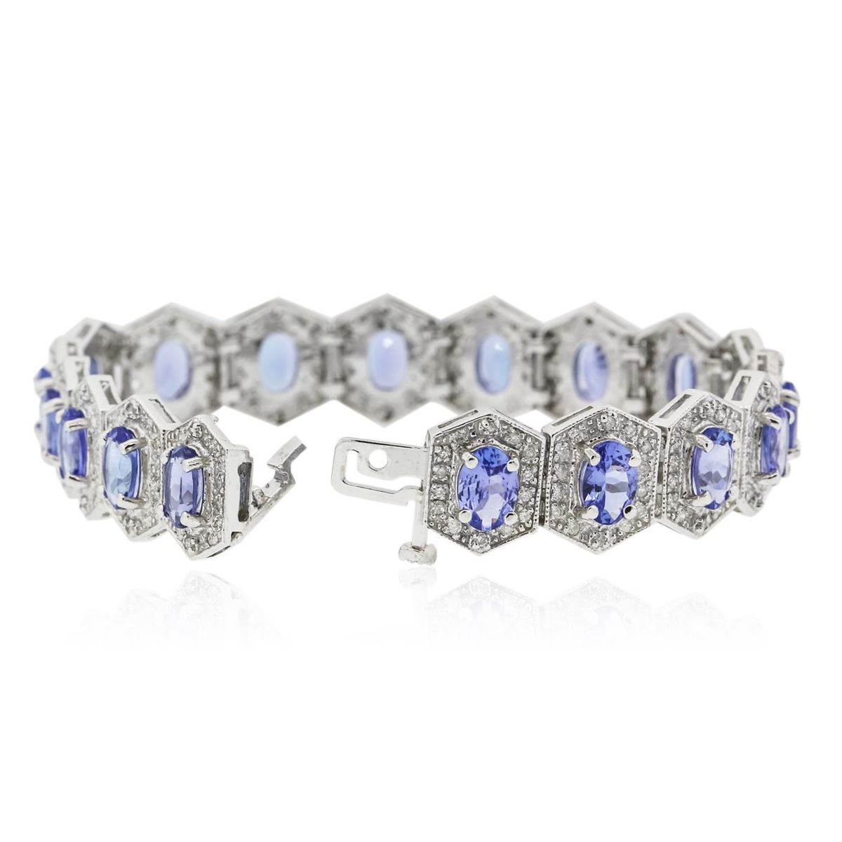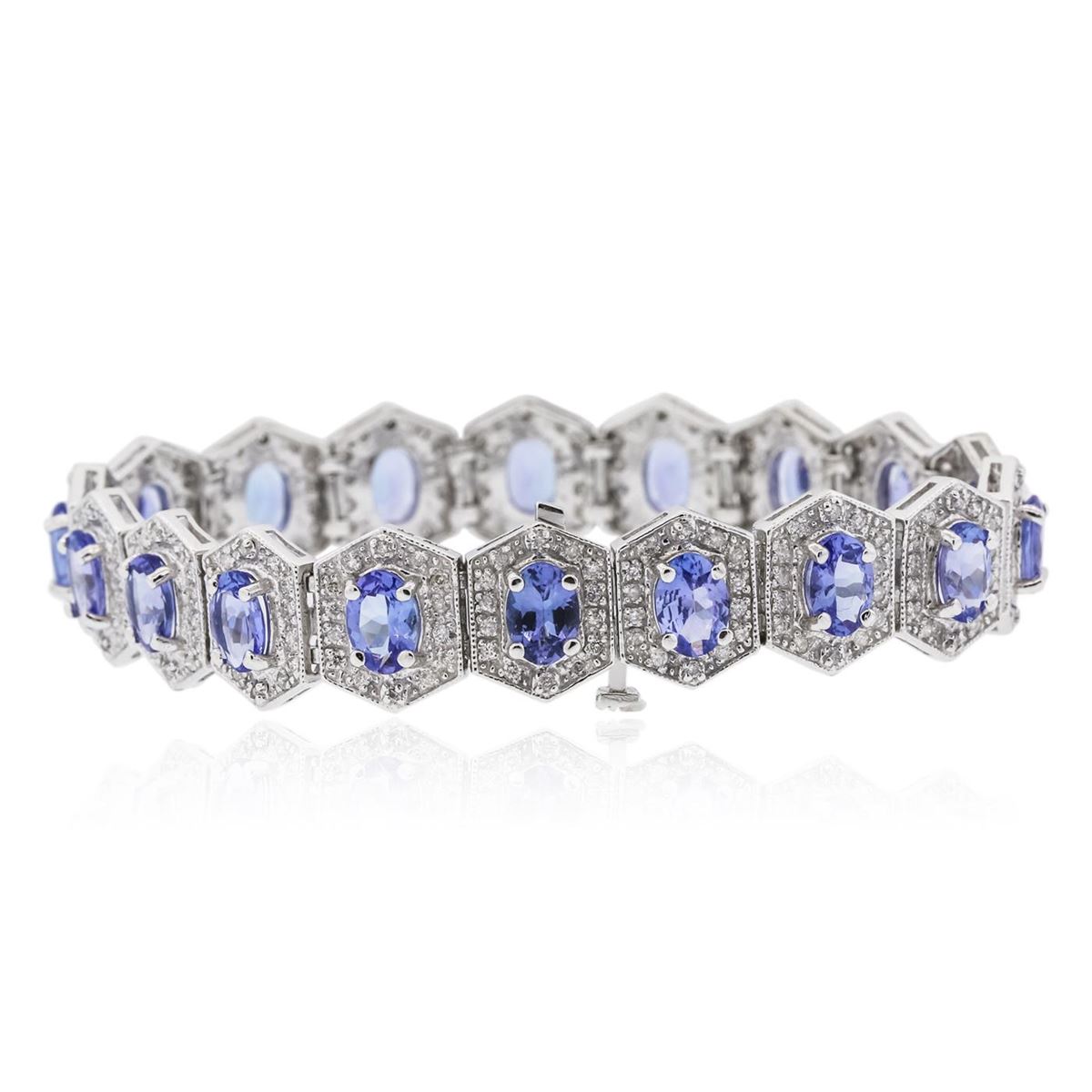 One electronically tested 14KT white gold ladies combination cast & assembled tanzanite and diamond bracelet with a hidden box clasp with a bright polish finish. Measurements: 7.25" in length. Identified with markings of "14K". Condition is new. Containing: Eighteen prong set oval modified brilliant cut natural tanzanites, measuring 7.50 x 4.50 x 2.93mm, approximate total weight of 12.60ct., clarity is eye clean, type I, medium, moderately strong, violet color, (GIA V 5/4), cut is good. Two Hundred Fifty-Two prong set round brilliant cut diamonds, measuring 1.30 - 1.30 x 0.78mm (depth est.) approximate total weight of 252 Stones = 2.02ct. Clarity: I-1 to I-2. Color: I - J, Cut is Good. Colored gemstones are presumed to have been subjected to commonly used enhancement processes. All diamonds and colored gemstones are graded in the mounting, unless otherwise stated. Total Weight of Colored Stones 12.60ct. Total Weight of Diamonds 2.02ct. Total Weight of Bracelet 27.90 grams. GGL Appraised at $15,365.00.