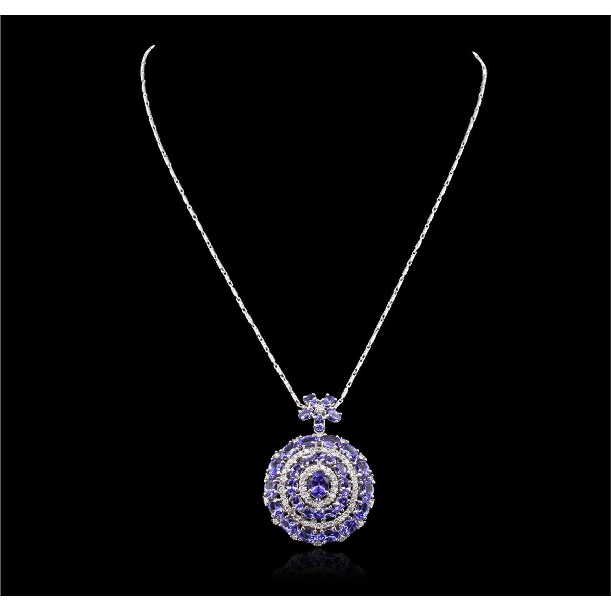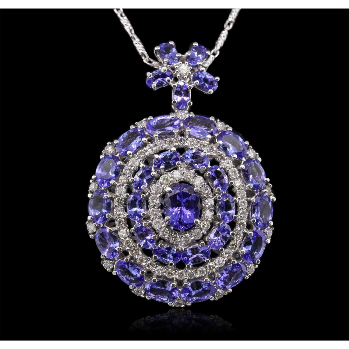 One electronically tested 14KT white gold Ladies combination cast & assembled pendant & chain 17.0" long, light fancy link with a lobster claw clasp with a bright polish finish. Condition is new. Identified with markings of "14K". Containing: One prong set oval modified brilliant cut natural tanzanite, measuring 7.80 x 6.40 x 4.16mm, approximate. Total Weight of 1.41ct., clarity is eye clean, type I, medium, moderately strong, bluish violet color, (GIA bV 5/4), cut is good. Fourteen prong set oval modified brilliant cut natural tanzanites, measuring 6.40 x 4.50 x 2.93mm, approximate. Total Weight of 8.12ct., clarity is eye clean, type I, medium, moderately strong, bluish violet color, (GIA bV 5/4), cut is good. Fifteen prong set oval modified brilliant cut natural tanzanites, measuring 5.00 x 3.00 x 1.95mm, approximate. Total Weight of 3.15ct., clarity is eye clean, type I, medium, moderately strong, bluish violet color, (GIA bV 5/4), cut is good. Colored gemstones are presumed to have been subjected to commonly used color/clarity enhancement processes. Sixty-Nine prong set round brilliant cut diamonds, measuring 1.50 - 1.50 x 0.90mm (depth est.) approximate. Total Weight of 69 Stones = 0.85ct. Clarity: I-1 to I-3. Color: H - I, Cut is Good. Total Weight of Colored Stones 12.68ct. Total Weight of Diamonds 0.85ct. Total Weight of Pendant & Chain 24.00 grams. GGL Appraised at $18,305.00.