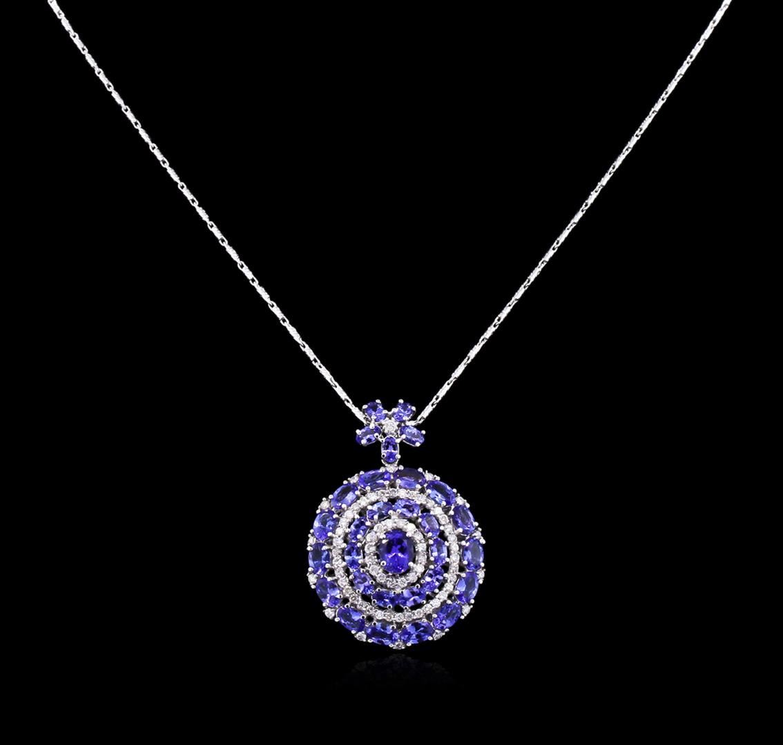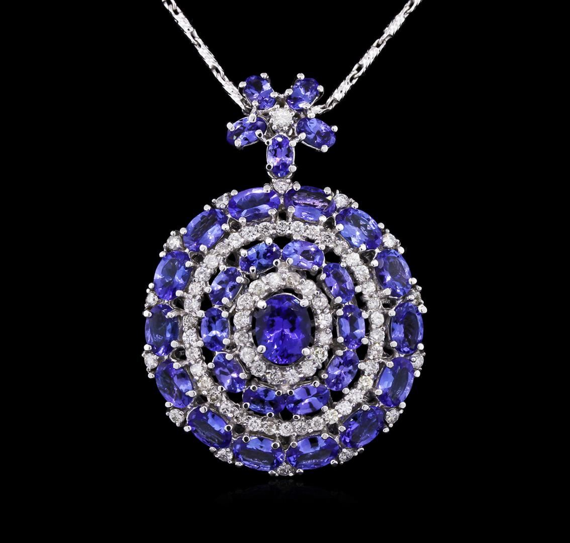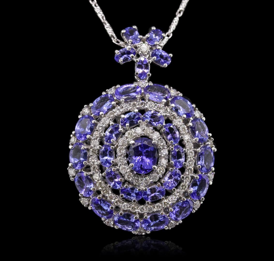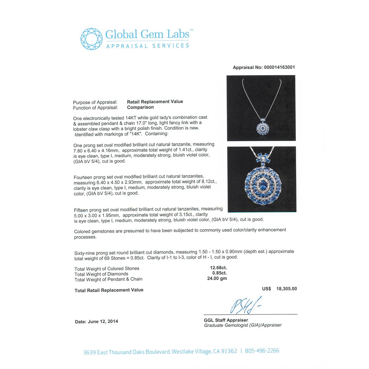 One electronically tested 14KT white gold Ladies combination cast & assembled pendant & chain 17.0" long, light fancy link with a lobster claw clasp with a bright polish finish. Condition is new. Identified with markings of "14K". Containing: One prong set oval modified brilliant cut natural tanzanite, measuring 7.80 x 6.40 x 4.16mm, approximate. Total Weight of 1.41ct., clarity is eye clean, type I, medium, moderately strong, bluish violet color, (GIA bV 5/4), cut is good. Fourteen prong set oval modified brilliant cut natural tanzanites, measuring 6.40 x 4.50 x 2.93mm, approximate. Total Weight of 8.12ct., clarity is eye clean, type I, medium, moderately strong, bluish violet color, (GIA bV 5/4), cut is good. Fifteen prong set oval modified brilliant cut natural tanzanites, measuring 5.00 x 3.00 x 1.95mm, approximate. Total Weight of 3.15ct., clarity is eye clean, type I, medium, moderately strong, bluish violet color, (GIA bV 5/4), cut is good. Colored gemstones are presumed to have been subjected to commonly used color/clarity enhancement processes. Sixty-Nine prong set round brilliant cut diamonds, measuring 1.50 - 1.50 x 0.90mm (depth est.) approximate. Total Weight of 69 Stones = 0.85ct. Clarity: I-1 to I-3. Color: H - I, Cut is Good. Total Weight of Colored Stones 12.68ct. Total Weight of Diamonds 0.85ct. Total Weight of Pendant & Chain 24.00 grams. GGL Appraised at $18,305.00.