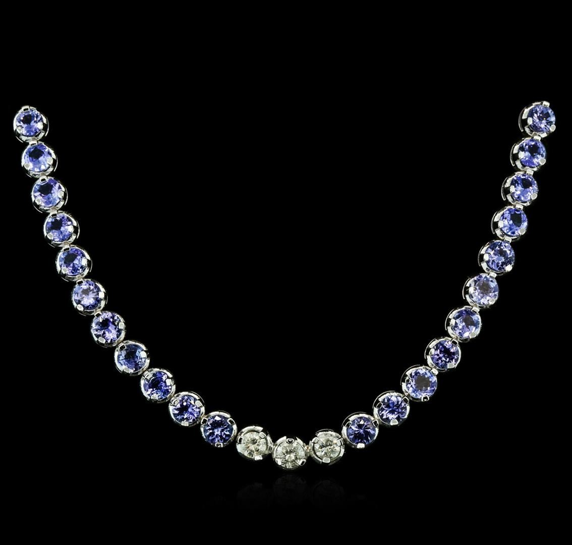 One electronically tested 14KT white gold ladies combination cast & assembled tanzanite and diamond necklace with a hidden box clasp with safety closer with a bright polish finish. Identified with markings of "14K". Condition is new. Containing: Twenty-six prong set round modified brilliant cut natural tanzanites, measuring 5.19 - 4.92 x 2.74 mm, approximate total weight of 12.74ct., clarity is eye clean, type I, medium light, very slightly grayish, violet color, (GIA V 4/3), cut is good. Three prong set round brilliant cut diamonds, measuring 4.78 - 4.62 x 2.98mm (depth est.) approximate total weight of 3 Stones = 1.21ct. Clarity: I-1 to I-2. Color: I - J, Cut is Good. All diamonds and colored gemstones are graded in the mounting, unless otherwise stated. Colored gemstones are presumed to have been subjected to commonly used enhancement processes. Total Weight of Colored Stones 12.74ct. Total Weight of Diamonds 1.21ct. Total Weight of Necklace 31.80 grams. GGL Appraised at $11,035.00.