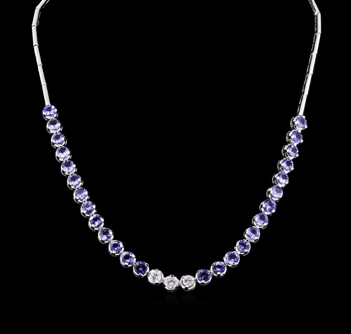 One electronically tested 14KT white gold ladies combination cast & assembled tanzanite and diamond necklace with a hidden box clasp with safety closer with a bright polish finish. Identified with markings of "14K". Condition is new. Containing: Twenty-six prong set round modified brilliant cut natural tanzanites, measuring 5.19 - 4.92 x 2.74 mm, approximate total weight of 12.74ct., clarity is eye clean, type I, medium light, very slightly grayish, violet color, (GIA V 4/3), cut is good. Three prong set round brilliant cut diamonds, measuring 4.78 - 4.62 x 2.98mm (depth est.) approximate total weight of 3 Stones = 1.21ct. Clarity: I-1 to I-2. Color: I - J, Cut is Good. All diamonds and colored gemstones are graded in the mounting, unless otherwise stated. Colored gemstones are presumed to have been subjected to commonly used enhancement processes. Total Weight of Colored Stones 12.74ct. Total Weight of Diamonds 1.21ct. Total Weight of Necklace 31.80 grams. GGL Appraised at $11,035.00.