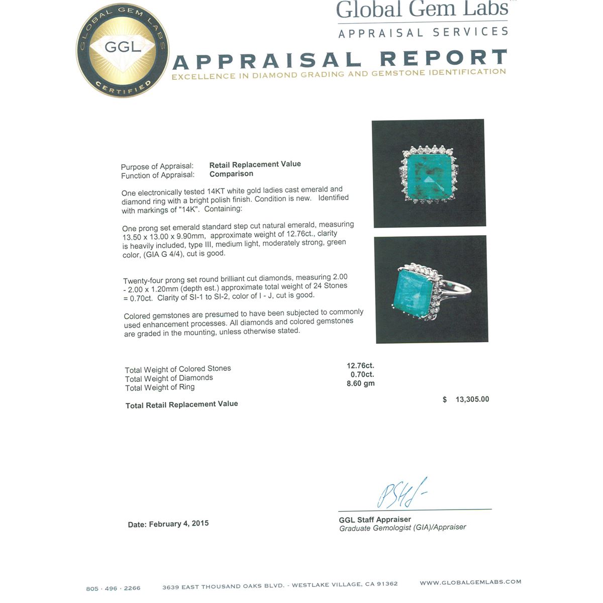One electronically tested 14KT white gold ladies cast emerald and diamond ring with a bright polish finish. Identified with markings of "14K". Condition is new. Containing: One prong set emerald standard step cut natural emerald, measuring 13.50 x 13.00 x 9.90mm, approximate weight of 12.76ct., clarity is heavily included, type III, medium light, moderately strong, green color, (GIA G 4/4), cut is good. Twenty-Four prong set round brilliant cut diamonds, measuring 2.00 - 2.00 x 1.20mm (depth est.) approximate total weight of 24 Stones = 0.70ct. Clarity: SI-1 to SI-2. Color: I - J, Cut is Good. Colored gemstones are presumed to have been subjected to commonly used enhancement processes. All diamonds and colored gemstones are graded in the mounting, unless otherwise stated. Total Weight of Colored Stones 12.76ct. Total Weight of Diamonds 0.70ct. Total Weight of Ring 8.60 grams. GGL Appraised at $13,305.00.