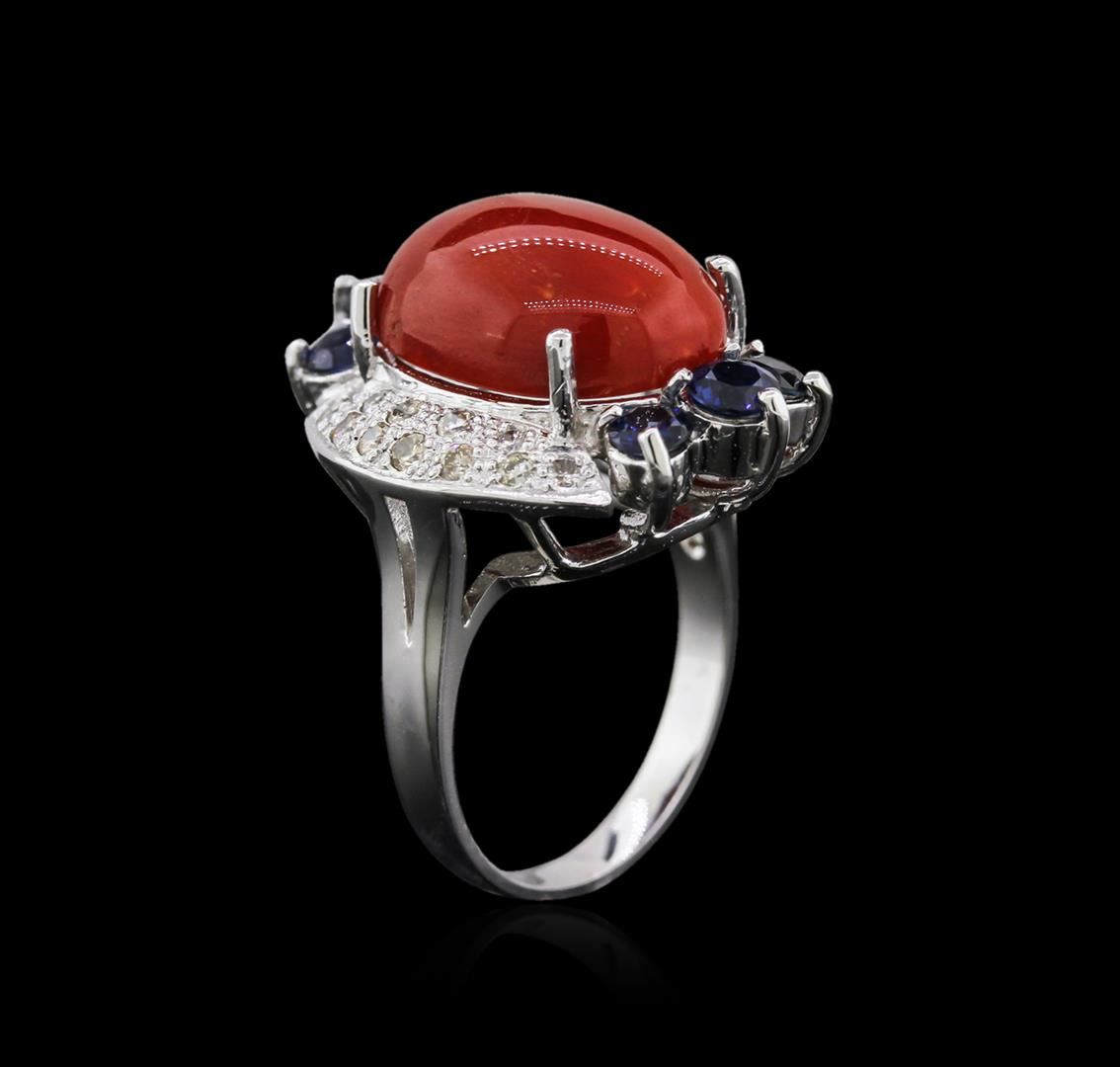 One electronically tested 14KT white gold ladies cast coral, sapphire and diamond ring with a bright polish finish. Identified with markings of "14K". Condition is new. Containing: One prong set oval cabochon cut natural red coral, measuring 15.00 x 11.00 x 7.15mm, approximate weight of 12.90ct., clarity is heavily included, medium, brownish, red color, (GIA R 5/1), cut is good. Six prong set round modified brilliant cut natural blue sapphires, measuring 4.00 - 4.00 x 2.60 mm, approximate total weight of 1.98ct., clarity is eye clean, type II, medium, moderately strong, blue color, (GIA B 5/4), cut is good. Twenty-Two prong set round brilliant cut diamonds, measuring 1.50 - 1.50 x 0.90mm (depth est.) approximate total weight of 22 Stones = 0.27ct. Clarity: I-1. Color: J - K, Cut is Good. All diamonds and colored gemstones are graded in the mounting, unless otherwise stated. Colored gemstones are presumed to have been subjected to commonly used enhancement processes. Total Weight of Colored Stones 14.88ct. Total Weight of Diamonds 0.27ct. Total Weight of Ring 8.00 grams. GGL Appraised at $3,955.00.