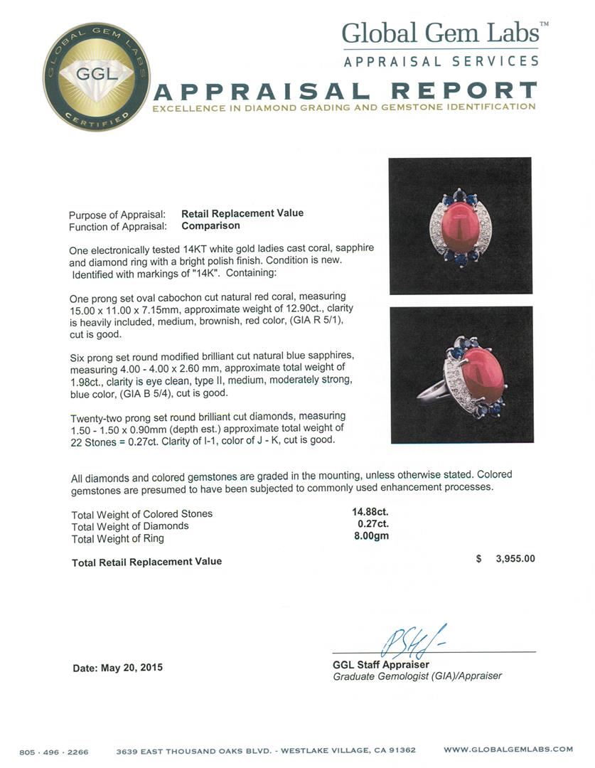 One electronically tested 14KT white gold ladies cast coral, sapphire and diamond ring with a bright polish finish. Identified with markings of "14K". Condition is new. Containing: One prong set oval cabochon cut natural red coral, measuring 15.00 x 11.00 x 7.15mm, approximate weight of 12.90ct., clarity is heavily included, medium, brownish, red color, (GIA R 5/1), cut is good. Six prong set round modified brilliant cut natural blue sapphires, measuring 4.00 - 4.00 x 2.60 mm, approximate total weight of 1.98ct., clarity is eye clean, type II, medium, moderately strong, blue color, (GIA B 5/4), cut is good. Twenty-Two prong set round brilliant cut diamonds, measuring 1.50 - 1.50 x 0.90mm (depth est.) approximate total weight of 22 Stones = 0.27ct. Clarity: I-1. Color: J - K, Cut is Good. All diamonds and colored gemstones are graded in the mounting, unless otherwise stated. Colored gemstones are presumed to have been subjected to commonly used enhancement processes. Total Weight of Colored Stones 14.88ct. Total Weight of Diamonds 0.27ct. Total Weight of Ring 8.00 grams. GGL Appraised at $3,955.00.