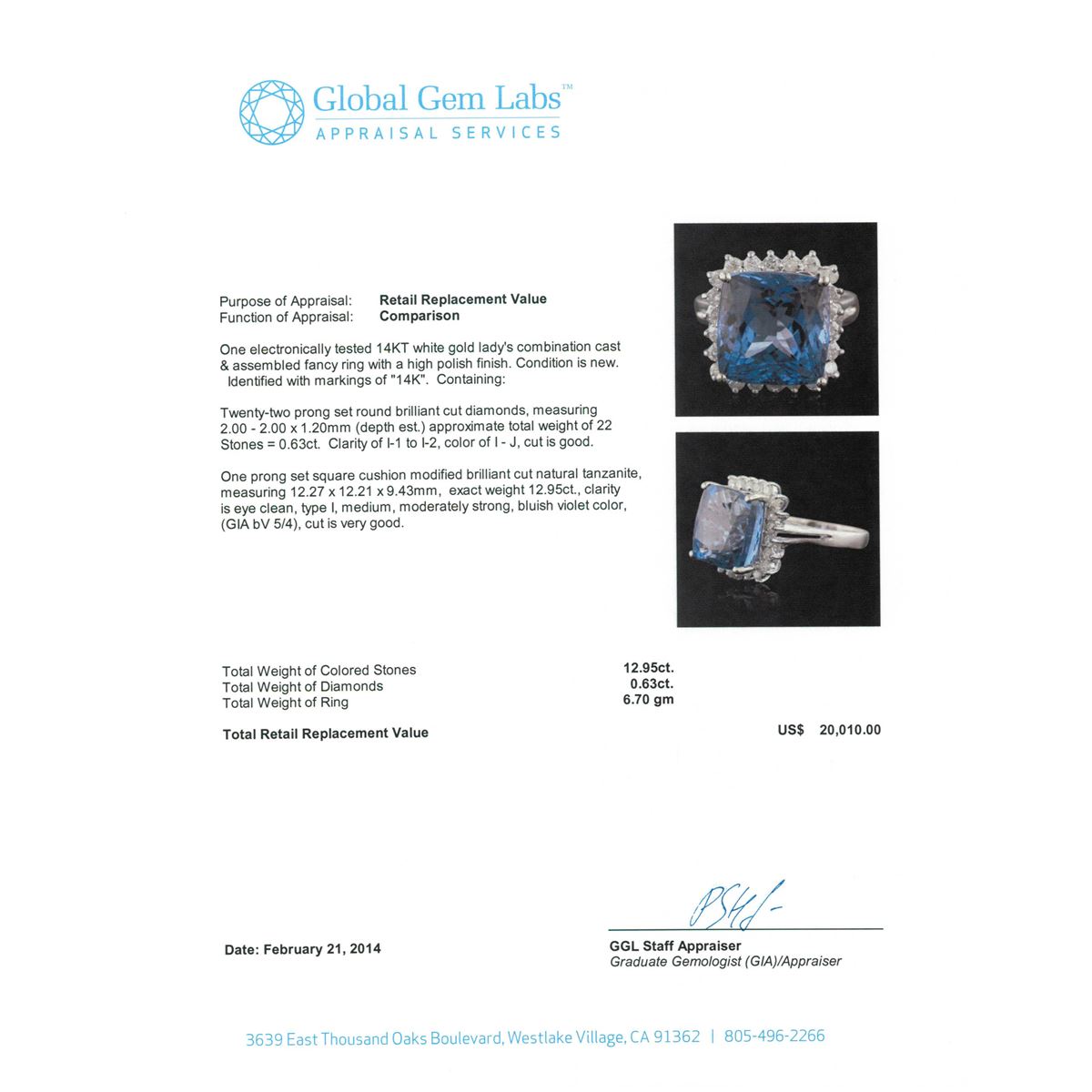 One electronically tested 14KT white gold Ladies combination cast & assembled fancy ring with a high polish finish. Condition is new. Identified with markings of "14K". Containing: Twenty-Two prong set round brilliant cut diamonds, measuring 2.00 - 2.00 x 1.20mm (depth est.) approximate. Total Weight of 22 Stones = 0.63ct. Clarity: I-1 to I-2. Color: I - J, Cut is Good. One prong set square cushion modified brilliant cut natural tanzanite, measuring 12.27 x 12.21 x 9.43mm, exact weight 12.95ct., clarity is eye clean, type I, medium, moderately strong, bluish violet color, (GIA bV 5/4), cut is very good. GIA Report: 6157964698.Total Weight of Colored Stones 12.95ct. Total Weight of Diamonds 0.63ct. Total Weight of Ring 6.70 grams. GGL Appraised at $20,010.00.