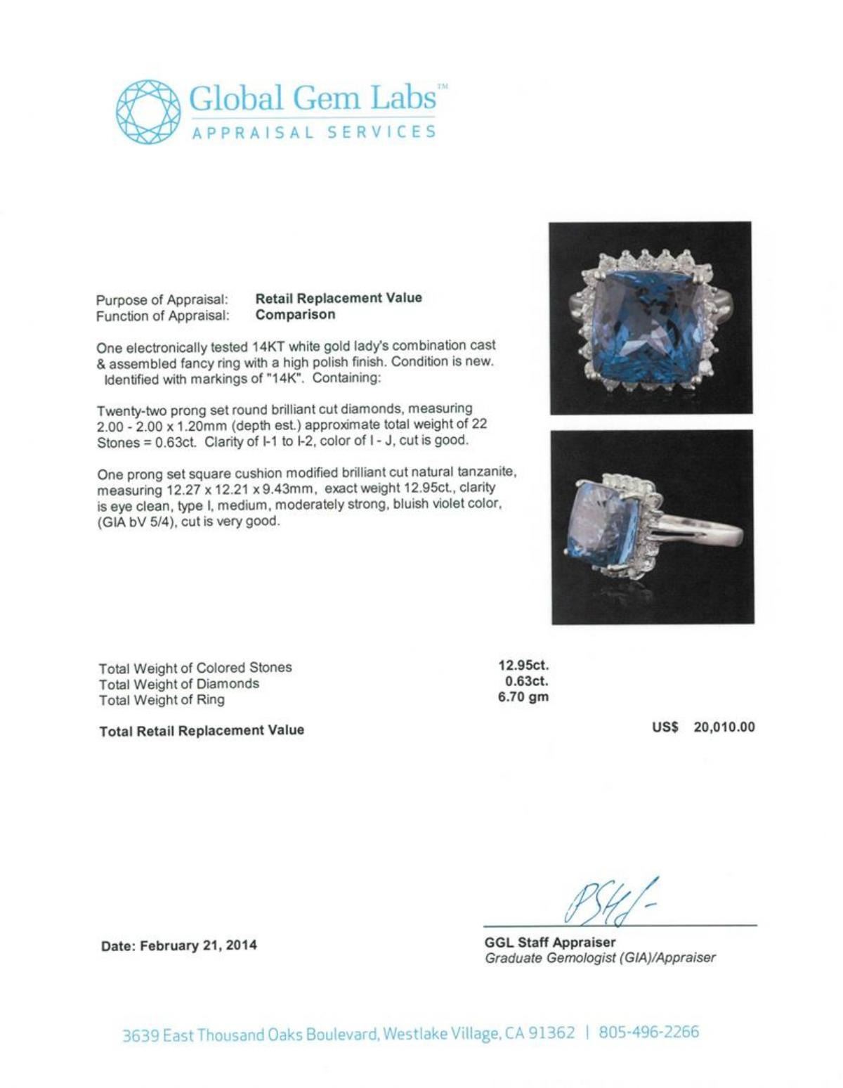 One electronically tested 14KT white gold Ladies combination cast & assembled fancy ring with a high polish finish. Condition is new. Identified with markings of "14K". Containing: Twenty-Two prong set round brilliant cut diamonds, measuring 2.00 - 2.00 x 1.20mm (depth est.) approximate. Total Weight of 22 Stones = 0.63ct. Clarity: I-1 to I-2. Color: I - J, Cut is Good. One prong set square cushion modified brilliant cut natural tanzanite, measuring 12.27 x 12.21 x 9.43mm, exact weight 12.95ct., clarity is eye clean, type I, medium, moderately strong, bluish violet color, (GIA bV 5/4), cut is very good. GIA Report: 6157964698.Total Weight of Colored Stones 12.95ct. Total Weight of Diamonds 0.63ct. Total Weight of Ring 6.70 grams. GGL Appraised.