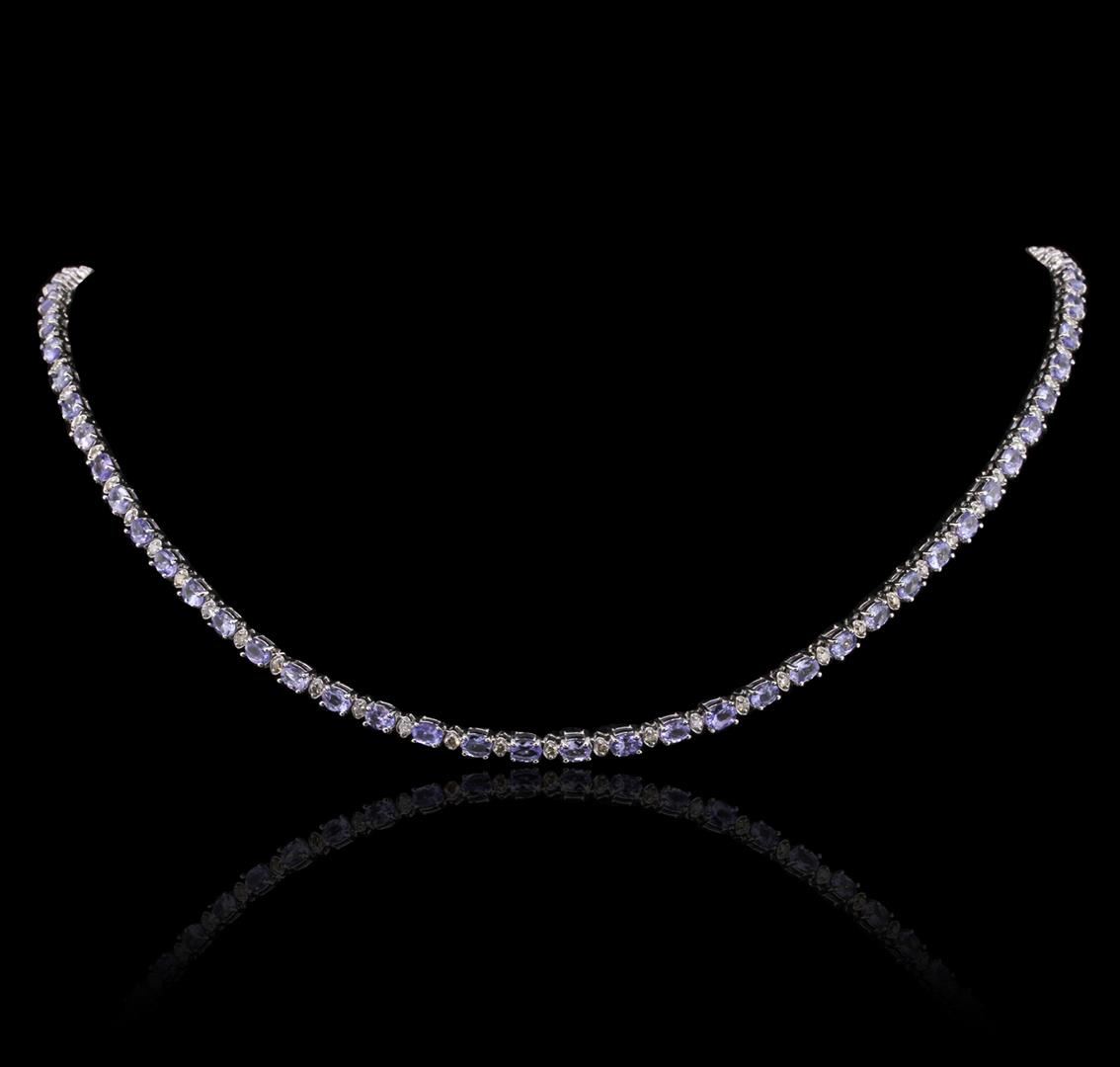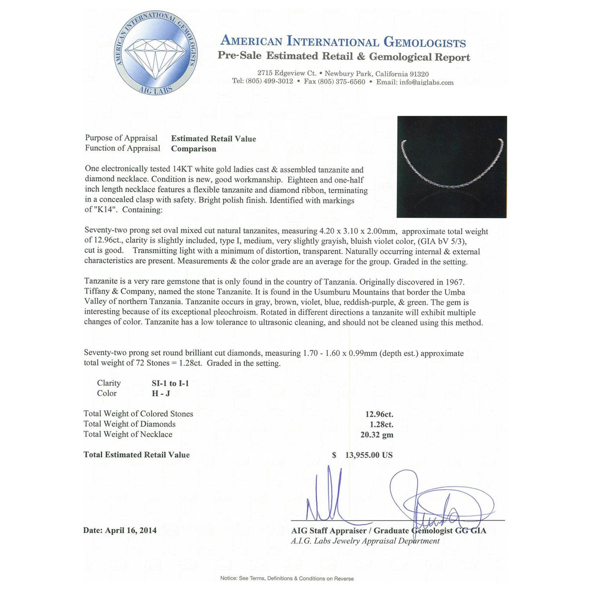 One electronically tested 14KT white gold ladies cast & assembled tanzanite and diamond necklace. Condition is new, good workmanship. Eighteen and one-half inch length necklace features a flexible tanzanite and diamond ribbon, terminating in a concealed clasp with safety. Bright polish finish. Identified with markings of "K14". Containing: Seventy-two prong set oval mixed cut natural tanzanites, measuring 4.20 x 3.10 x 2.00mm, approximate. Total Weight of 12.96ct., clarity is slightly included, type I, medium, very slightly grayish, bluish violet color, (GIA bV 5/3), cut is good. Transmitting light with a minimum of distortion, transparent. Naturally occurring internal & external characteristics are present. Measurements & the color grade are an average for the group. Graded in the setting. Tanzanite is a very rare gemstone that is only found in the country of Tanzania. Originally discovered in 1967. Tiffany & Company, named the stone Tanzanite. It is found in the Usumburu Mountains that border the Umba Valley of northern Tanzania. Tanzanite occurs in gray, brown, violet, blue, reddish-purple, & green. The gem is interesting because of its exceptional pleochroism. Rotated in different directions a tanzanite will exhibit multiple changes of color. Tanzanite has a low tolerance to ultrasonic cleaning, and should not be cleaned using this method. Seventy-Two prong set round brilliant cut diamonds, measuring 1.70 - 1.60 x 0.99mm (depth est.) approximate. Total Weight of 72 Stones = 1.28ct. Graded in the setting. Clarity: SI-1 to I-1. Color: H - J. Total Weight of Colored Stones 12.96ct. Total Weight of Diamonds 1.28ct. Total Weight of Necklace 20.32 grams. AIG Appraised at $13,955.00.