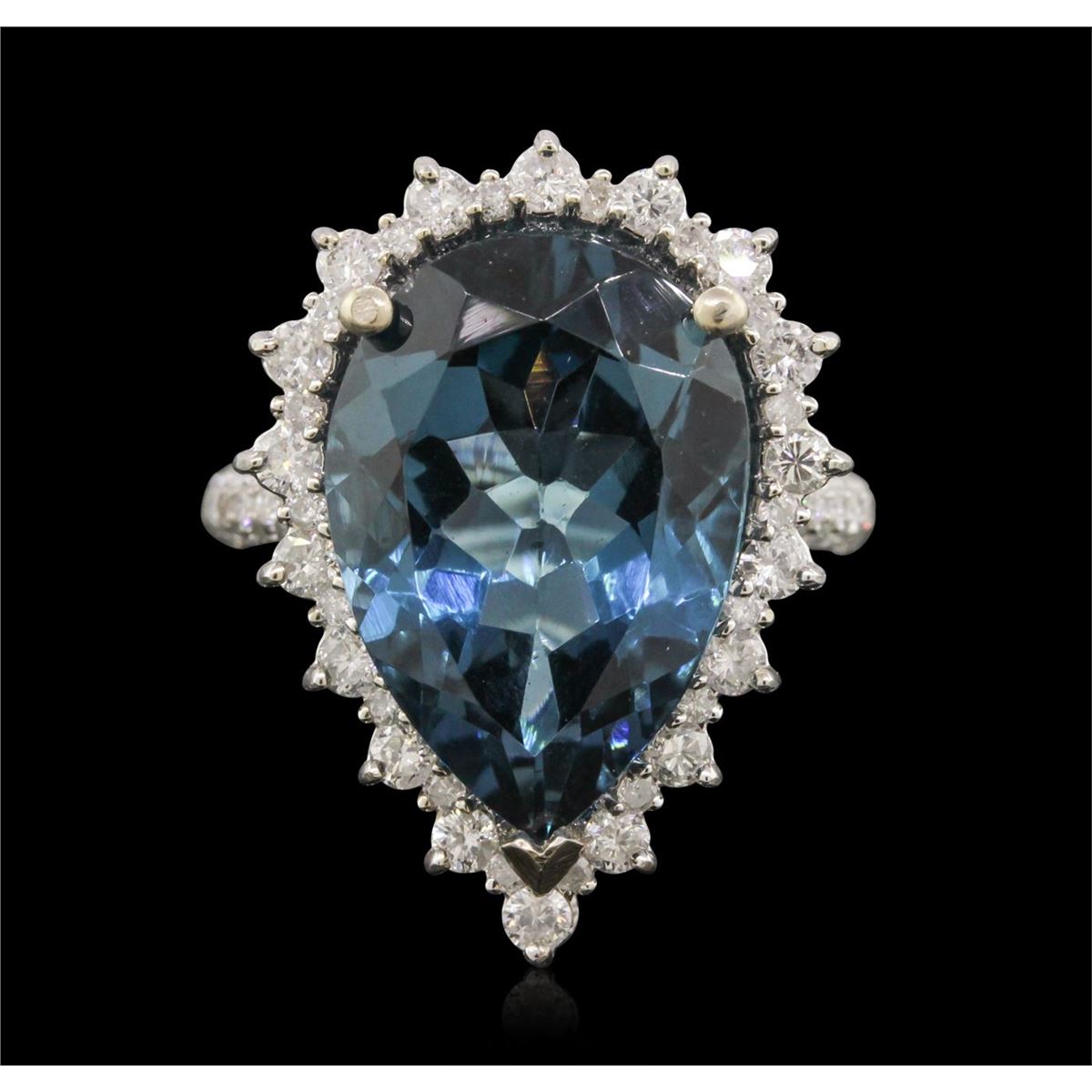 One electronically tested 14KT white gold Ladies combination cast & assembled ring with a bright polish finish. Condition is new. Identified with markings of "14K". Containing: One prong set pear modified brilliant cut natural blue topaz, measuring 18.00 x 12.56 x 8.16mm, approximate. Total Weight of 13.02ct., clarity is eye clean, type I, medium, moderately strong, very slightly greenish blue color, (GIA vslgB 5/4), cut is good. Eighteen prong set round brilliant cut diamonds, measuring 2.10 - 2.10 x 1.26mm (depth est.) approximate. Total Weight of 18 Stones = 0.61ct. Clarity: SI-1 to I-1. Color: I - J, Cut is Good. Colored gemstones are presumed to have been subjected to commonly used enhancement processes. All diamonds and colored gemstones are graded in the mounting, unless otherwise stated. Total Weight of Colored Stones 13.02ct. Total Weight of Diamonds 0.61ct. Total Weight of Ring 7.40 grams. GGL Appraised at $4,275.00.