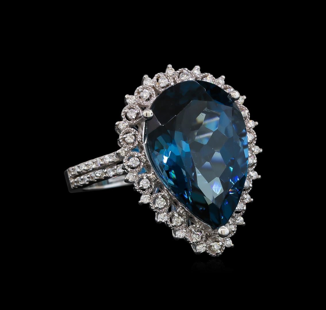 One electronically tested 14KT white gold ladies cast topaz and diamond ring with a split shoulder shank with a bright polish finish. Identified with markings of "14K". Condition is new. Containing: One prong set pear modified brilliant cut natural blue topaz, measuring 18.80 x 13.00 x 8.45mm, approximate weight of 13.10ct., clarity is eye clean, type I, medium, very slightly grayish, very slightly greenish blue color, (GIA vslgB 5/3), cut is good. Sixty-Six prong set round brilliant cut diamonds, measuring 1.20 - 1.20 x 0.72mm (depth est.) approximate total weight of 66 Stones = 0.39ct. Clarity: SI-2 to I-1. Color: H - I, Cut is Good. All diamonds and colored gemstones are graded in the mounting, unless otherwise stated. Colored gemstones are presumed to have been subjected to commonly used enhancement processes.. Total Weight of Colored Stones 13.10ct. Total Weight of Diamonds 0.39ct. Total Weight of Ring 8.90 grams. GGL Appraised at $3,090.00.