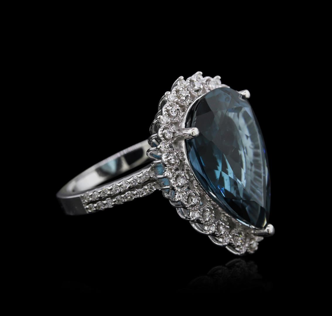 One electronically tested 14KT white gold ladies cast topaz and diamond ring with a split shoulder shank with a bright polish finish. Identified with markings of "14K". Condition is new. Containing: One prong set pear modified brilliant cut natural blue topaz, measuring 18.80 x 13.00 x 8.45mm, approximate weight of 13.10ct., clarity is eye clean, type I, medium, very slightly grayish, very slightly greenish blue color, (GIA vslgB 5/3), cut is good. Sixty-Six prong set round brilliant cut diamonds, measuring 1.20 - 1.20 x 0.72mm (depth est.) approximate total weight of 66 Stones = 0.39ct. Clarity: SI-2 to I-1. Color: H - I, Cut is Good. All diamonds and colored gemstones are graded in the mounting, unless otherwise stated. Colored gemstones are presumed to have been subjected to commonly used enhancement processes.. Total Weight of Colored Stones 13.10ct. Total Weight of Diamonds 0.39ct. Total Weight of Ring 8.90 grams. GGL Appraised at $3,090.00.