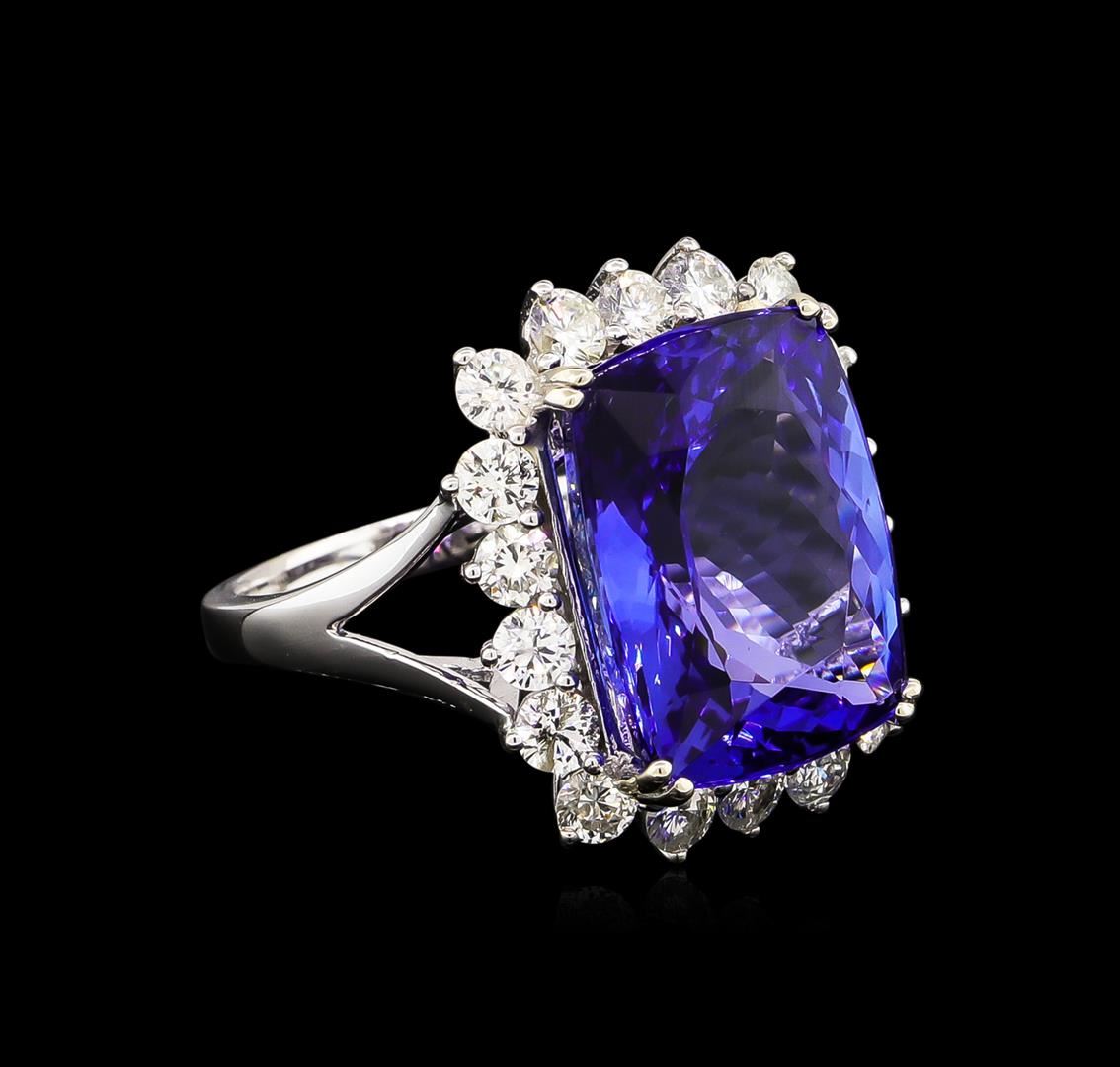 One electronically tested 14KT white gold Ladies combination cast & assembled fancy ring with a high polish finish. Identified with markings of "14K". Condition is new. Containing: Eighteen prong set round brilliant cut diamonds, measuring 3.00 - 3.00 x 1.80mm (depth est.) approximate. Total Weight of 18 Stones = 1.81ct. Clarity: I-1 to I-2. Color: H - I, Cut is Good. One prong set rectangular cushion modified brilliant cut natural tanzanite, measuring 16.18 x 12.64 x 7.83mm, exact weight 13.13ct., clarity is eye clean, type I, medium, moderately strong, violetish blue color, (GIA vB 5/4), cut is very good. GIA Report: 2151964474.Total Weight of Colored Stones 13.13ct. Total Weight of Diamonds 1.81ct. Total Weight of Ring 7.40gm. GGL Appraised at $22,585.00.