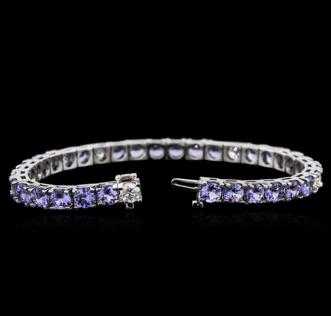 One electronically tested 14KT white gold ladies cast tanzanite and diamond bracelet with a hidden box clasp with safety closer with a bright polish finish. Measurements: 7" in length Identified with markings of "14K". Condition is new. Containing: Thirty prong set round modified brilliant cut natural tanzanites, measuring 5.00 - 5.00 x 3.25 mm, approximate total weight of 13.13ct., clarity is eye clean, type I, medium light, very slightly grayish, violet color, (GIA V 4/3), cut is good. Five prong set round brilliant cut diamonds, measuring 4.80 - 4.80 x 2.88mm (depth est.) approximate total weight of 5 Stones = 2.30ct. Clarity: I-1 to I-2. Color: I - J, Cut is Good. Colored gemstones are presumed to have been subjected to commonly used enhancement processes. All diamonds and colored gemstones are graded in the mounting, unless otherwise stated. Total Weight of Colored Stones 13.13ct. Total Weight of Diamonds 2.30ct. Total Weight of Bracelet 20.70 grams. GGL Appraised at $8,690.00.