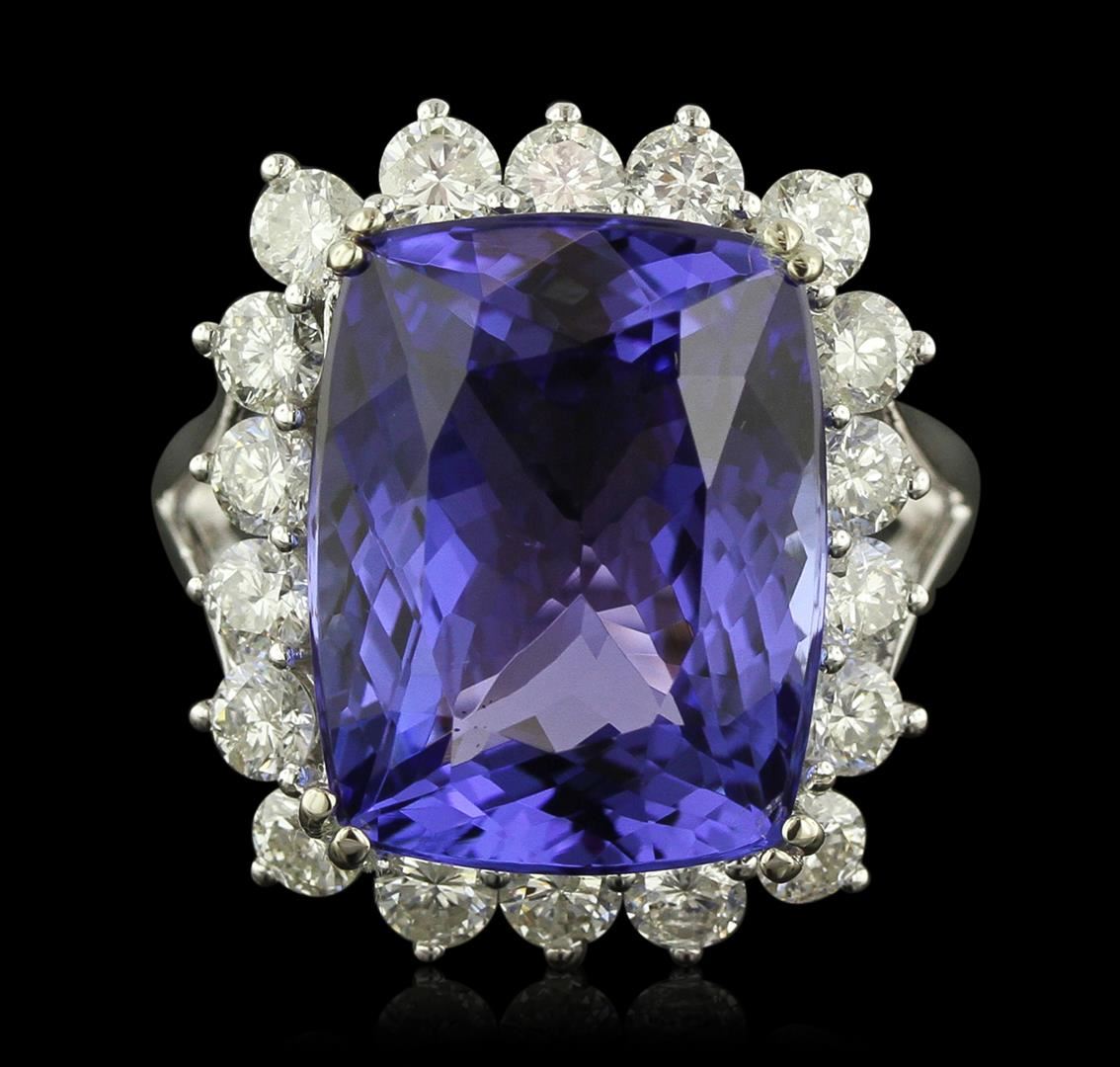 One electronically tested 14KT white gold Ladies combination cast & assembled fancy ring with a high polish finish. Identified with markings of "14K". Condition is new. Containing: Eighteen prong set round brilliant cut diamonds, measuring 3.00 - 3.00 x 1.80mm (depth est.) approximate. Total Weight of 18 Stones = 1.81ct. Clarity: I-1 to I-2. Color: H - I, Cut is Good. One prong set rectangular cushion modified brilliant cut natural tanzanite, measuring 16.18 x 12.64 x 7.83mm, exact weight 13.13ct., clarity is eye clean, type I, medium, moderately strong, violetish blue color, (GIA vB 5/4), cut is very good. GIA Report: 2151964474.Total Weight of Colored Stones 13.13ct. Total Weight of Diamonds 1.81ct. Total Weight of Ring 7.40gm. GGL Appraised at $22,585.00.