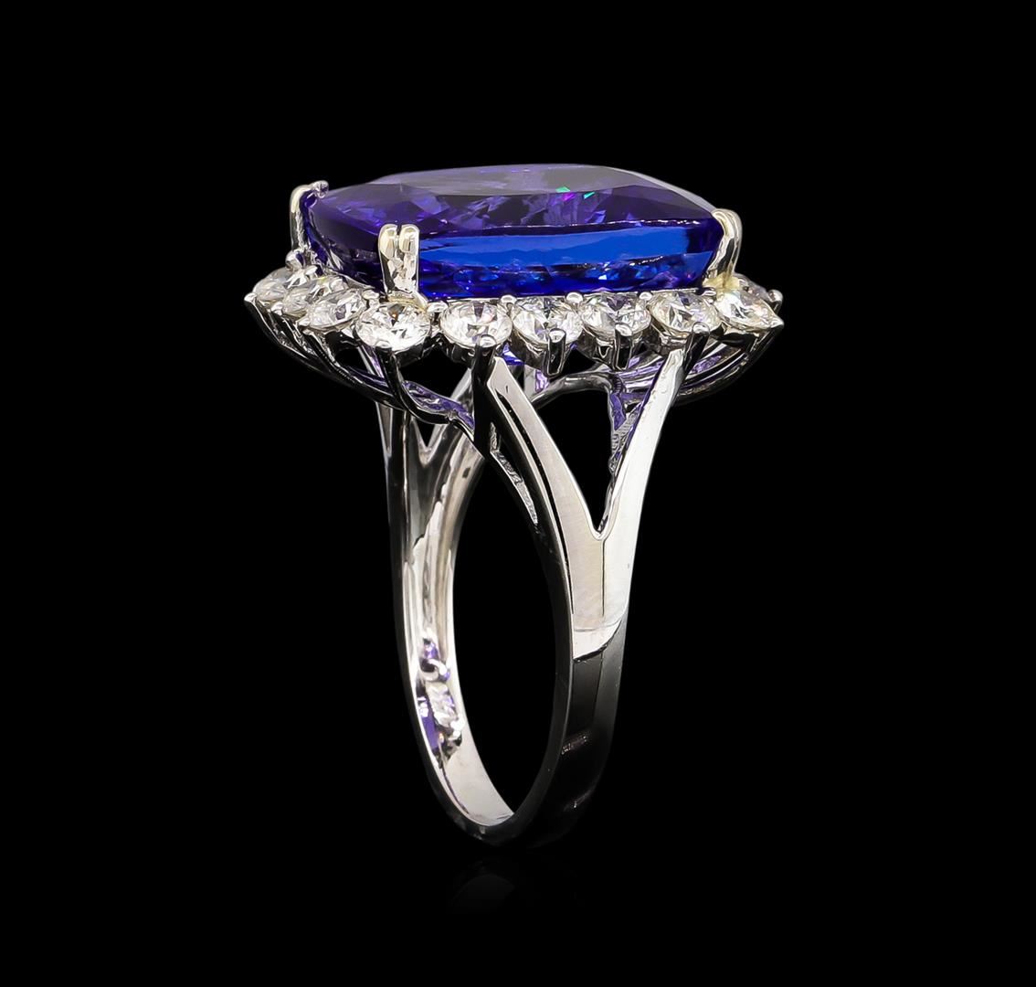 One electronically tested 14KT white gold Ladies combination cast & assembled fancy ring with a high polish finish. Identified with markings of "14K". Condition is new. Containing: Eighteen prong set round brilliant cut diamonds, measuring 3.00 - 3.00 x 1.80mm (depth est.) approximate. Total Weight of 18 Stones = 1.81ct. Clarity: I-1 to I-2. Color: H - I, Cut is Good. One prong set rectangular cushion modified brilliant cut natural tanzanite, measuring 16.18 x 12.64 x 7.83mm, exact weight 13.13ct., clarity is eye clean, type I, medium, moderately strong, violetish blue color, (GIA vB 5/4), cut is very good. GIA Report: 2151964474.Total Weight of Colored Stones 13.13ct. Total Weight of Diamonds 1.81ct. Total Weight of Ring 7.40gm. GGL Appraised at $22,585.00.