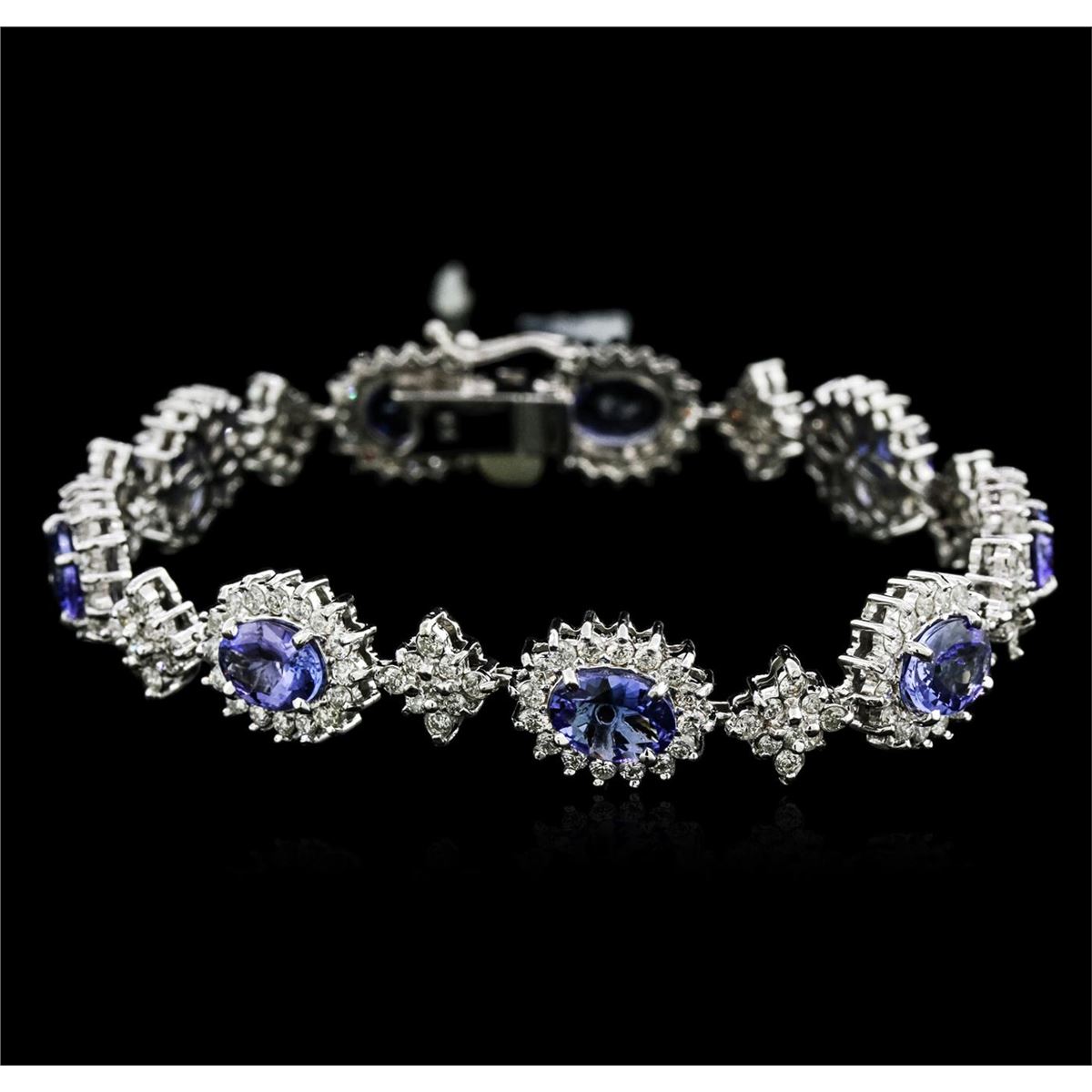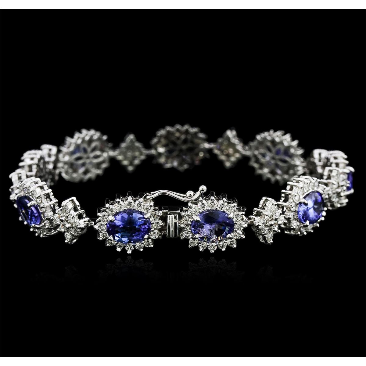 One electronically tested 14KT white gold ladies cast tanzanite and diamond bracelet with a hidden box clasp with safety closer with a bright polish finish. Measurements: 7.25" in length Identified with markings of "14K". Condition is new. Containing: Nine prong set oval modified brilliant cut natural tanzanites, measuring 8.30 x 6.20 x 4.03mm, approximate total weight of 13.14ct., clarity is eye clean, type I, medium light, very slightly grayish, violet color, (GIA V 4/3), cut is good. Two Hundred Sixteen prong set round brilliant cut diamonds, measuring 1.80 - 1.80 x 1.08mm (depth est.) approximate total weight of 216 Stones = 4.60ct. Clarity: SI-1 to SI-2. Color: I - J. Colored gemstones are presumed to have been subjected to commonly used enhancement processes, All diamonds and colored gemstones are graded in the mounting, unless otherwise stated. Total Weight of Colored Stones 13.14ct. Total Weight of Diamonds 4.60ct. Total Weight of Bracelet 23.40 grams. GGL Appraised at $13,955.00.