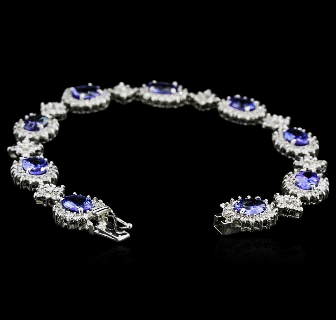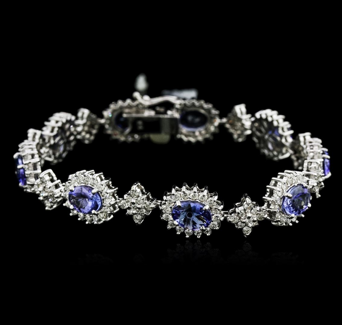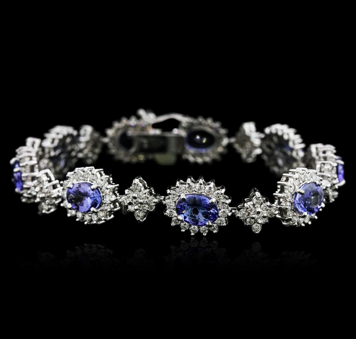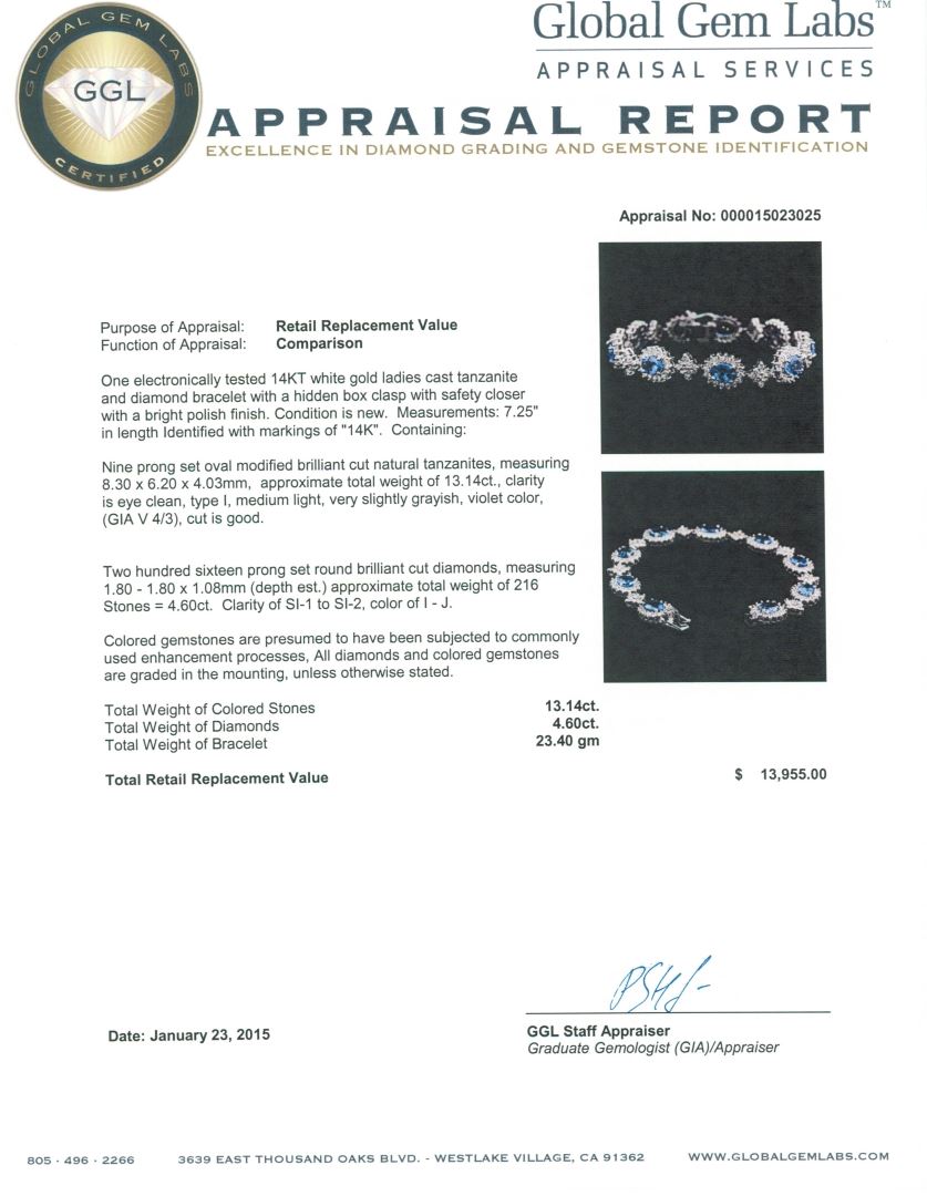 One electronically tested 14KT white gold ladies cast tanzanite and diamond bracelet with a hidden box clasp with safety closer with a bright polish finish. Measurements: 7.25" in length Identified with markings of "14K". Condition is new. Containing: Nine prong set oval modified brilliant cut natural tanzanites, measuring 8.30 x 6.20 x 4.03mm, approximate total weight of 13.14ct., clarity is eye clean, type I, medium light, very slightly grayish, violet color, (GIA V 4/3), cut is good. Two Hundred Sixteen prong set round brilliant cut diamonds, measuring 1.80 - 1.80 x 1.08mm (depth est.) approximate total weight of 216 Stones = 4.60ct. Clarity: SI-1 to SI-2. Color: I - J. Colored gemstones are presumed to have been subjected to commonly used enhancement processes, All diamonds and colored gemstones are graded in the mounting, unless otherwise stated. Total Weight of Colored Stones 13.14ct. Total Weight of Diamonds 4.60ct. Total Weight of Bracelet 23.40 grams. GGL Appraised at $13,955.00.