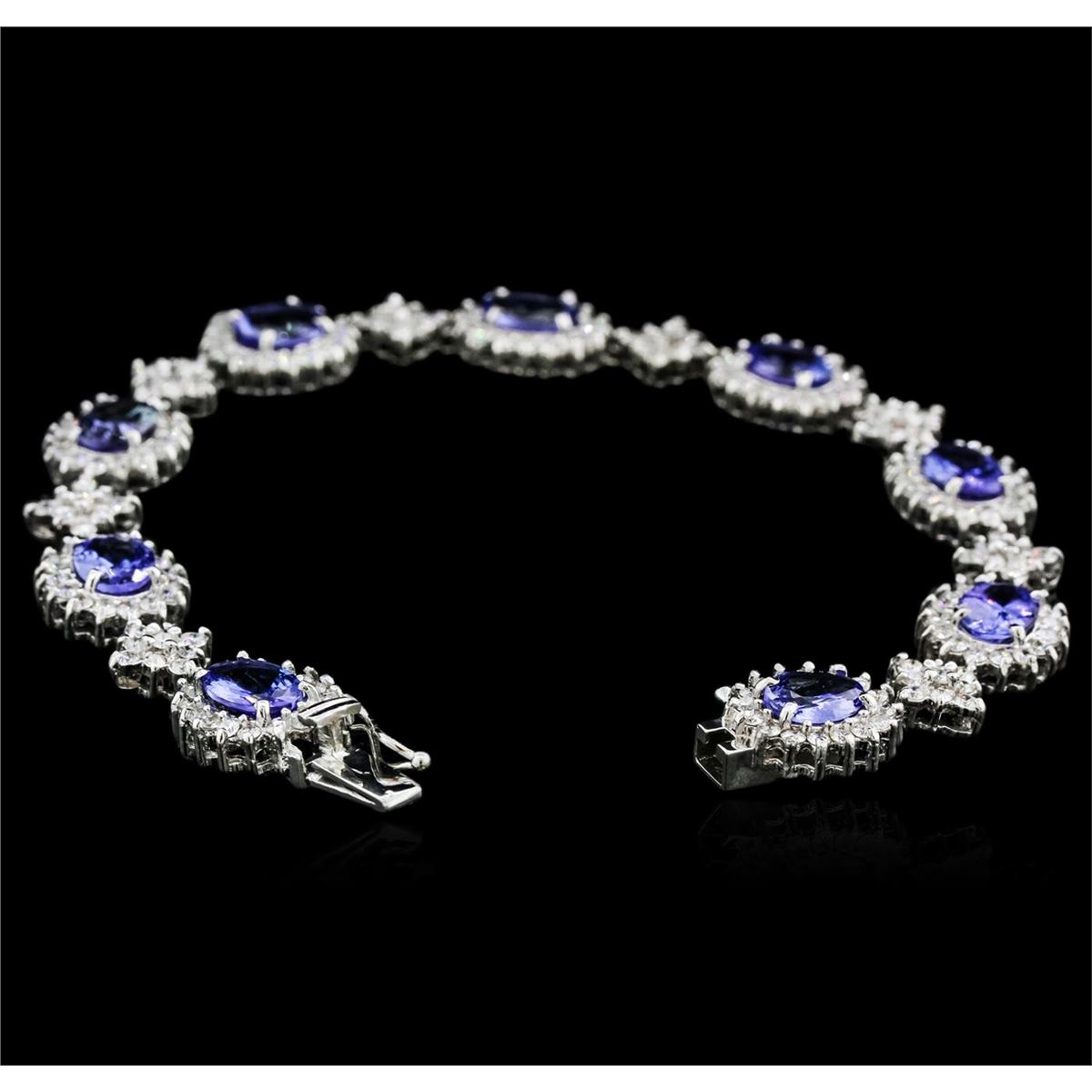 One electronically tested 14KT white gold ladies cast tanzanite and diamond bracelet with a hidden box clasp with safety closer with a bright polish finish. Measurements: 7.25" in length Identified with markings of "14K". Condition is new. Containing: Nine prong set oval modified brilliant cut natural tanzanites, measuring 8.30 x 6.20 x 4.03mm, approximate total weight of 13.14ct., clarity is eye clean, type I, medium light, very slightly grayish, violet color, (GIA V 4/3), cut is good. Two Hundred Sixteen prong set round brilliant cut diamonds, measuring 1.80 - 1.80 x 1.08mm (depth est.) approximate total weight of 216 Stones = 4.60ct. Clarity: SI-1 to SI-2. Color: I - J. Colored gemstones are presumed to have been subjected to commonly used enhancement processes, All diamonds and colored gemstones are graded in the mounting, unless otherwise stated. Total Weight of Colored Stones 13.14ct. Total Weight of Diamonds 4.60ct. Total Weight of Bracelet 23.40 grams. GGL Appraised at $13,955.00.