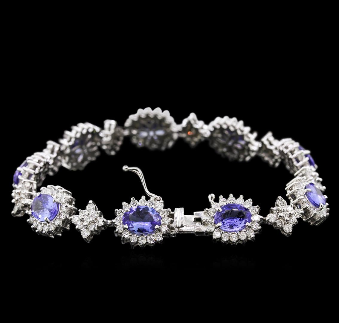 One electronically tested 14KT white gold ladies cast tanzanite and diamond bracelet with a hidden box clasp with safety closer with a bright polish finish. Measurements: 7.25" in length Identified with markings of "14K". Condition is new. Containing: Nine prong set oval modified brilliant cut natural tanzanites, measuring 8.30 x 6.20 x 4.03mm, approximate total weight of 13.14ct., clarity is eye clean, type I, medium light, very slightly grayish, violet color, (GIA V 4/3), cut is good. Two Hundred Sixteen prong set round brilliant cut diamonds, measuring 1.80 - 1.80 x 1.08mm (depth est.) approximate total weight of 216 Stones = 4.60ct. Clarity: SI-1 to SI-2. Color: I - J. Colored gemstones are presumed to have been subjected to commonly used enhancement processes, All diamonds and colored gemstones are graded in the mounting, unless otherwise stated. Total Weight of Colored Stones 13.14ct. Total Weight of Diamonds 4.60ct. Total Weight of Bracelet 23.40 grams. GGL Appraised at $13,955.00.