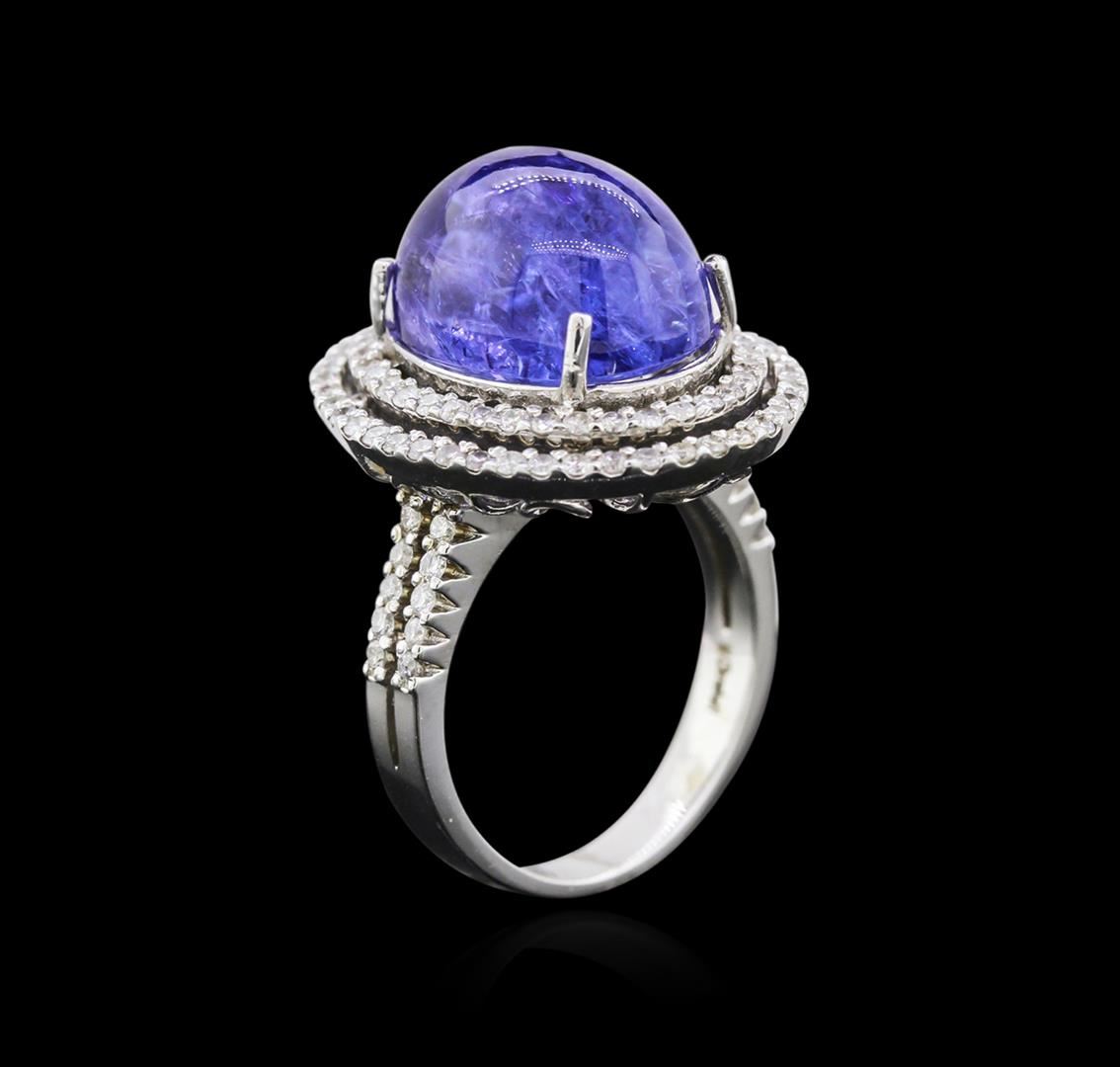One ring featuring: 14KT white gold weighing 7.50 grams containing one tanzanite center stone with a total weight of 13.17ct and 102 round diamonds with a total weight of 0.96ct.