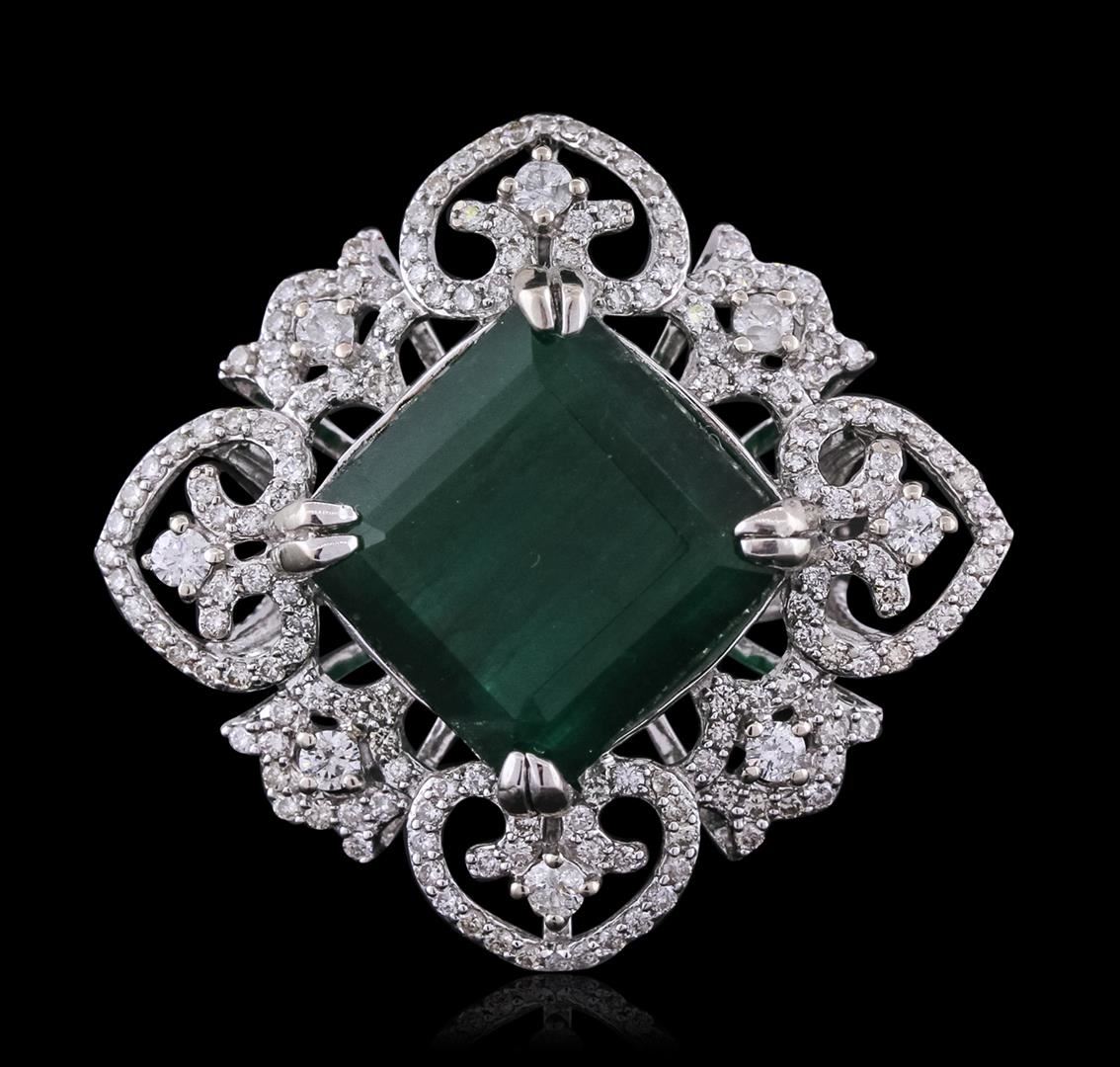 One electronically tested 14KT white gold ladies combination cast & assembled ring with a bright polish finish. Condition is new. Identified with markings of "14K". Containing: One prong set emerald standard brilliant cut natural emerald, measuring 13.90 x 13.60 x 9.52mm, approximate weight of 13.22ct., clarity is heavily included, type III, medium dark, moderately strong, green color, (GIA G 6/4), cut is good. Eight prong set round brilliant cut diamonds, measuring 2.00 - 2.00 x 1.20mm (depth est.) approximate total weight of 8 Stones = 0.23ct. Clarity: I-1 to I-2. Color: H - I, Cut is Good. Two Hundred Eight prong set round brilliant cut diamonds, measuring 1.20 - 1.20 x 0.72mm (depth est.) approximate total weight of 208 Stones = 1.31ct. Clarity: I-1 to I-2. Color: H - I, Cut is Good. Colored gemstones are presumed to have been subjected to commonly used enhancement processes. All diamonds and colored gemstones are graded in the mounting, unless otherwise stated. Total Weight of Colored Stones 13.22ct. Total Weight of Diamonds 1.54ct. Total Weight of Ring 10.30 grams. GGL Appraised at $17,525.00.