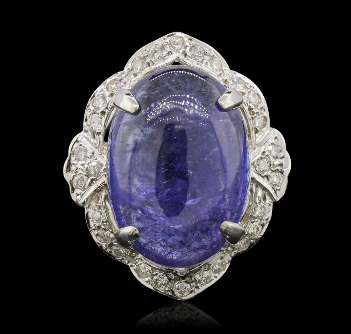 One electronically tested 14KT white gold ladies combination cast & assembled ring with a bright polish finish. Condition is new. Identified with markings of "14K". Containing: One prong set oval cabochon cut natural tanzanite, measuring 20.07 x 10.46 x 6.97mm, approximate weight of 13.23ct., clarity is moderately included, type I, medium light, very slightly grayish, bluish violet color, (GIA bV 4/3), cut is good. Twenty prong set round brilliant cut diamonds, measuring 1.80 - 1.80 x 1.08mm (depth est.) approximate. Total Weight of 20 Stones = 0.43ct. Clarity: I-1 to I-2. Color: I - J, Cut is Good. Colored gemstones are presumed to have been subjected to commonly used enhancement processes. All diamonds and colored gemstones are graded in the mounting, unless otherwise stated. Total Weight of Colored Stones 13.23ct. Total Weight of Diamonds 0.43ct. Total Weight of Ring 12.60 grams. GGL Appraised at $12,755.00.
