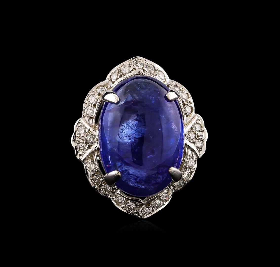 One electronically tested 14KT white gold ladies combination cast & assembled ring with a bright polish finish. Condition is new. Identified with markings of "14K". Containing: One prong set oval cabochon cut natural tanzanite, measuring 20.07 x 10.46 x 6.97mm, approximate weight of 13.23ct., clarity is moderately included, type I, medium light, very slightly grayish, bluish violet color, (GIA bV 4/3), cut is good. Twenty prong set round brilliant cut diamonds, measuring 1.80 - 1.80 x 1.08mm (depth est.) approximate. Total Weight of 20 Stones = 0.43ct. Clarity: I-1 to I-2. Color: I - J, Cut is Good. Colored gemstones are presumed to have been subjected to commonly used enhancement processes. All diamonds and colored gemstones are graded in the mounting, unless otherwise stated. Total Weight of Colored Stones 13.23ct. Total Weight of Diamonds 0.43ct. Total Weight of Ring 12.60 grams. GGL Appraised at $12,755.00.