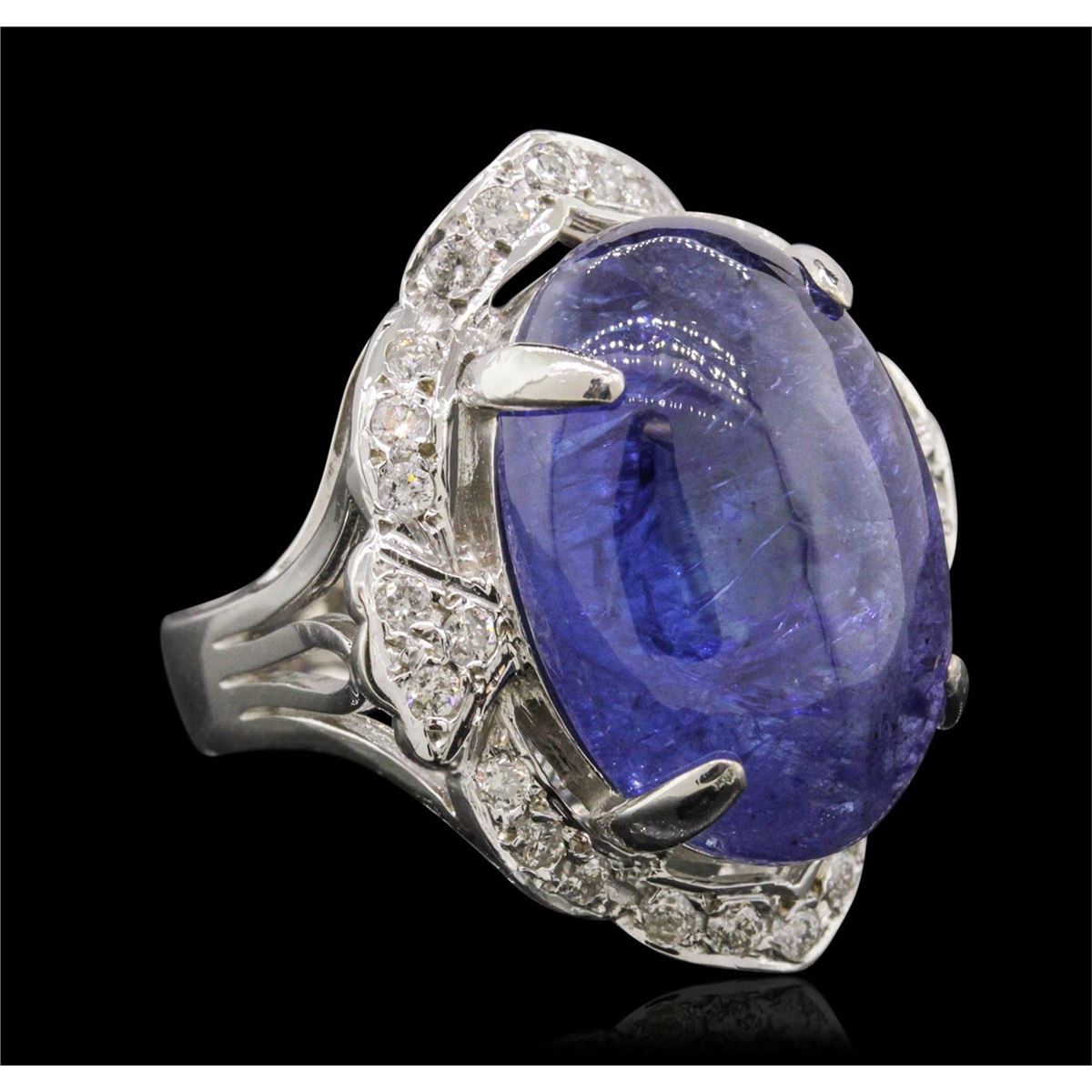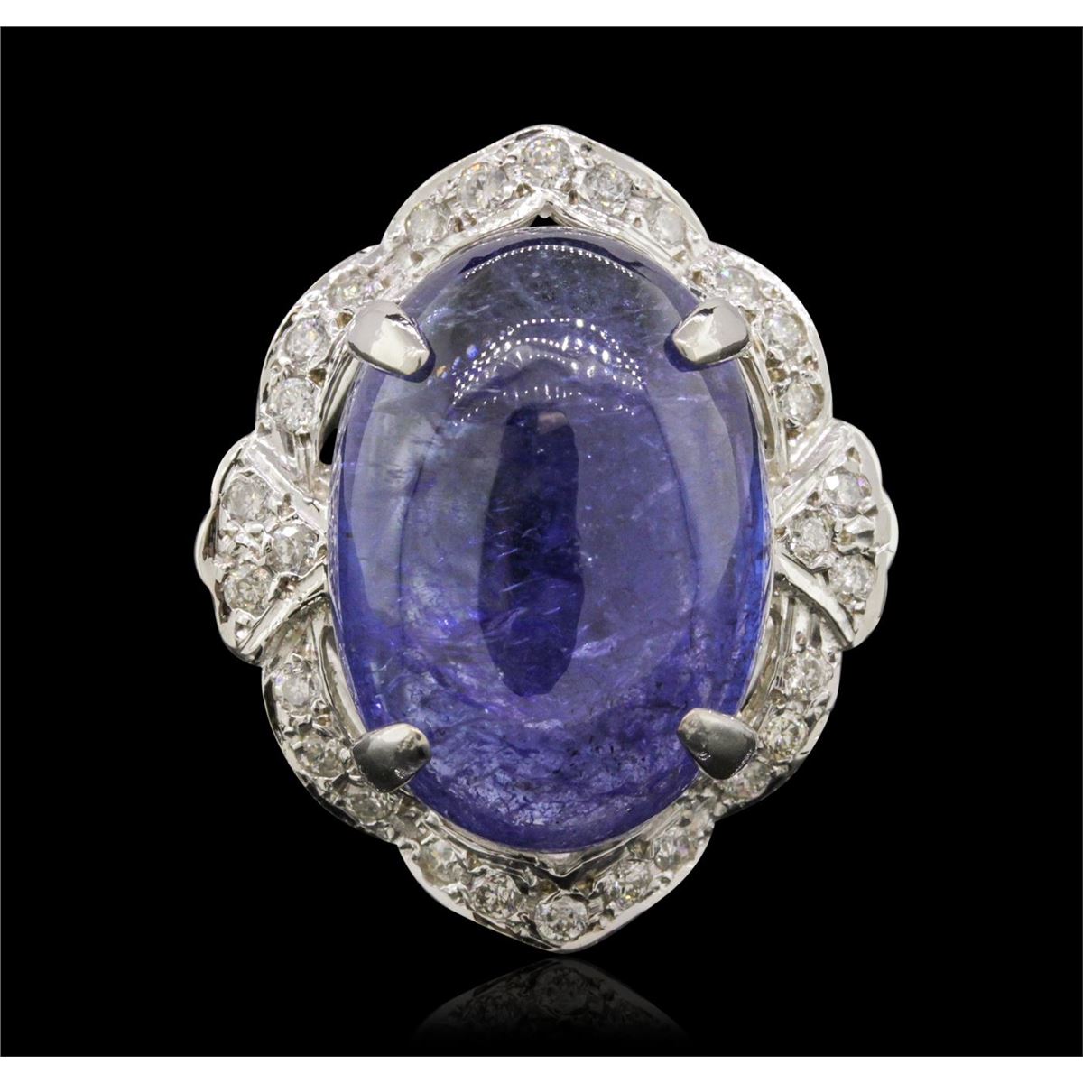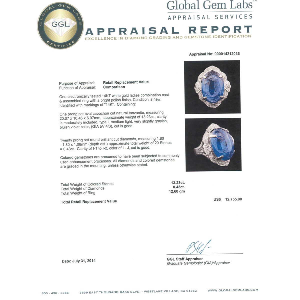 One electronically tested 14KT white gold ladies combination cast & assembled ring with a bright polish finish. Condition is new. Identified with markings of "14K". Containing: One prong set oval cabochon cut natural tanzanite, measuring 20.07 x 10.46 x 6.97mm, approximate weight of 13.23ct., clarity is moderately included, type I, medium light, very slightly grayish, bluish violet color, (GIA bV 4/3), cut is good. Twenty prong set round brilliant cut diamonds, measuring 1.80 - 1.80 x 1.08mm (depth est.) approximate. Total Weight of 20 Stones = 0.43ct. Clarity: I-1 to I-2. Color: I - J, Cut is Good. Colored gemstones are presumed to have been subjected to commonly used enhancement processes. All diamonds and colored gemstones are graded in the mounting, unless otherwise stated. Total Weight of Colored Stones 13.23ct. Total Weight of Diamonds 0.43ct. Total Weight of Ring 12.60 grams. GGL Appraised at $12,755.00.