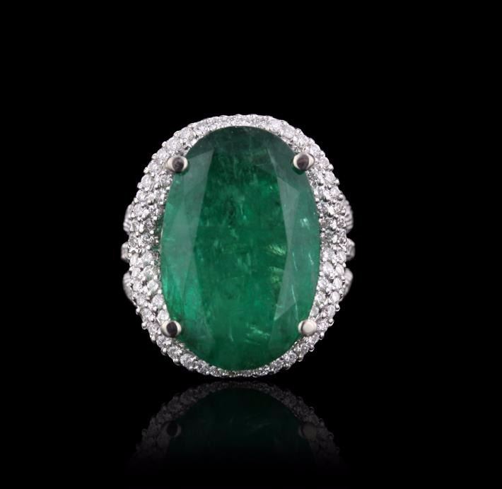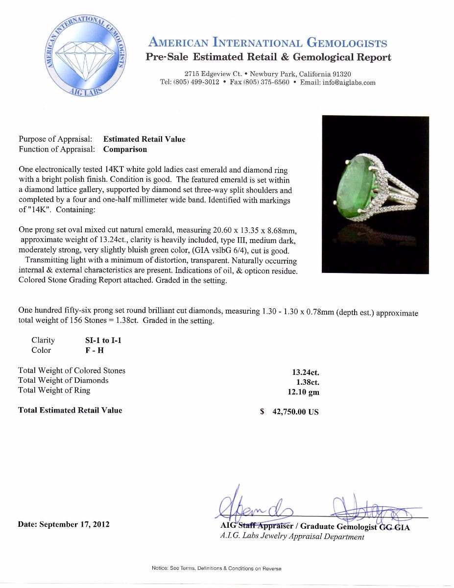 One electronically tested 14KT white gold ladies cast emerald and diamond ring with a bright polish finish. Condition is good. The featured emerald is set within a diamond lattice gallery, supported by diamond set three-way split shoulders and completed by a four and one-half millimeter wide band. Identified with markings of "14K". Containing: One prong set oval mixed cut natural emerald, measuring 20.60 x 13.35 x 8.68mm, approximate weight of 13.24ct., clarity is heavily included, type III, medium dark, moderately strong, very slightly bluish green color, (GIA vslbG 6/4), cut is good. Transmitting light with minimum of distortion, transparent. Naturally occurring internal & external characteristics are present. Indication of oil, & opticon residue. Colored Stone Grading Report attached. Graded in the setting. One hundred fifty-six prong set round brilliant cut diamonds, measuring 1.30-- 1.30 x 0.78mm (depth est.) approximate total weight of 156 Stones = 1.38ct. Graded in the setting. Clarity SI-1 to I-1. Color F - H. Total Weight of Emerald 13.24ct. Total Weight of Diamonds 1.38ct. Total Weight of Ring 12.10gm. AIG Appraised at $42,750.00.