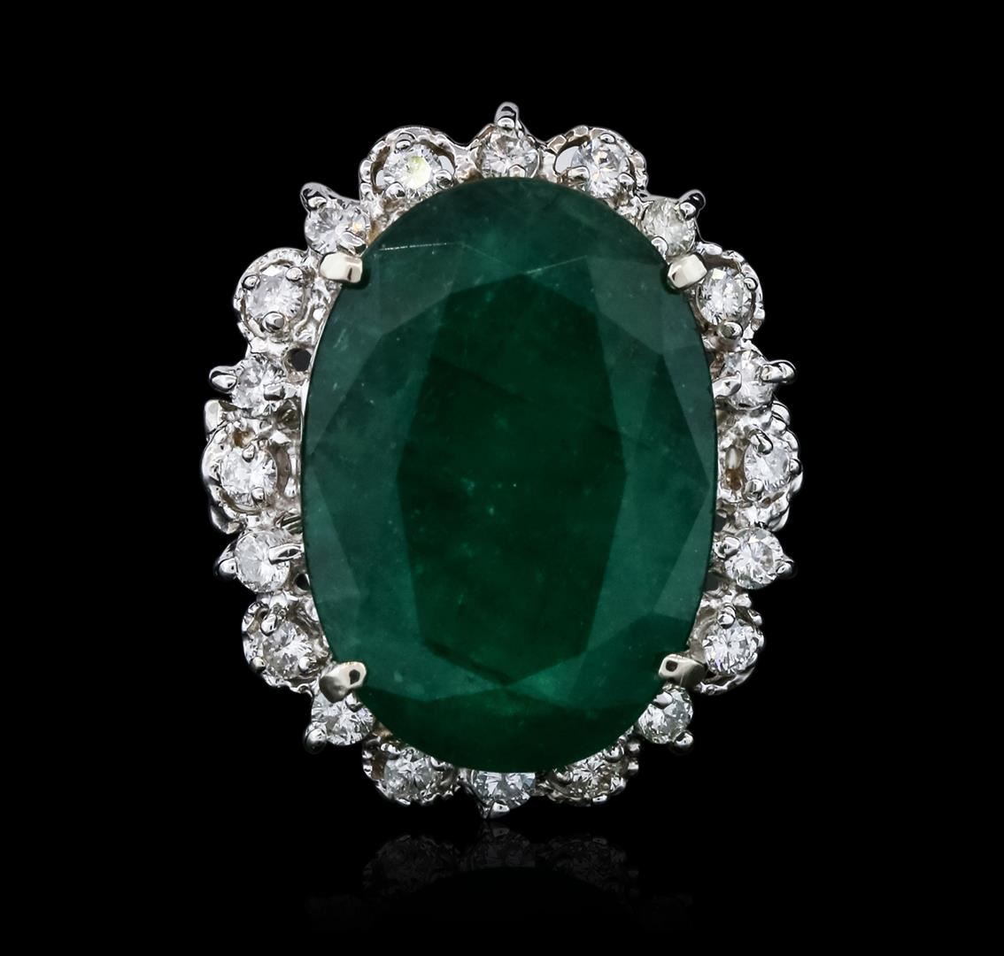 One electronically tested 14KT white gold ladies combination cast & assembled emerald and diamond ring with a bright polish finish. Identified with markings of "K14". Condition is new. Containing: One prong set oval modified brilliant cut natural emerald, measuring 20.46 x 14.42 x 7.92mm, approximate weight of 13.35ct., clarity is heavily included, type III, medium dark, moderately strong, green color, (GIA G 6/4), cut is good. Twenty prong set round brilliant cut diamonds, measuring 2.00 - 2.00 x 1.20mm (depth est.) approximate total weight of 20 Stones = 0.58ct. Clarity: SI-2 to I-1. Color: I - J, Cut is Good. Colored gemstones are presumed to have been subjected to commonly used enhancement processes. All diamonds and colored gemstones are graded in the mounting, unless otherwise stated. Total Weight of Colored Stones 13.35ct. Total Weight of Diamonds 0.58ct. Total Weight of Ring 9.40 grams. GGL Appraised at $7,335.00.