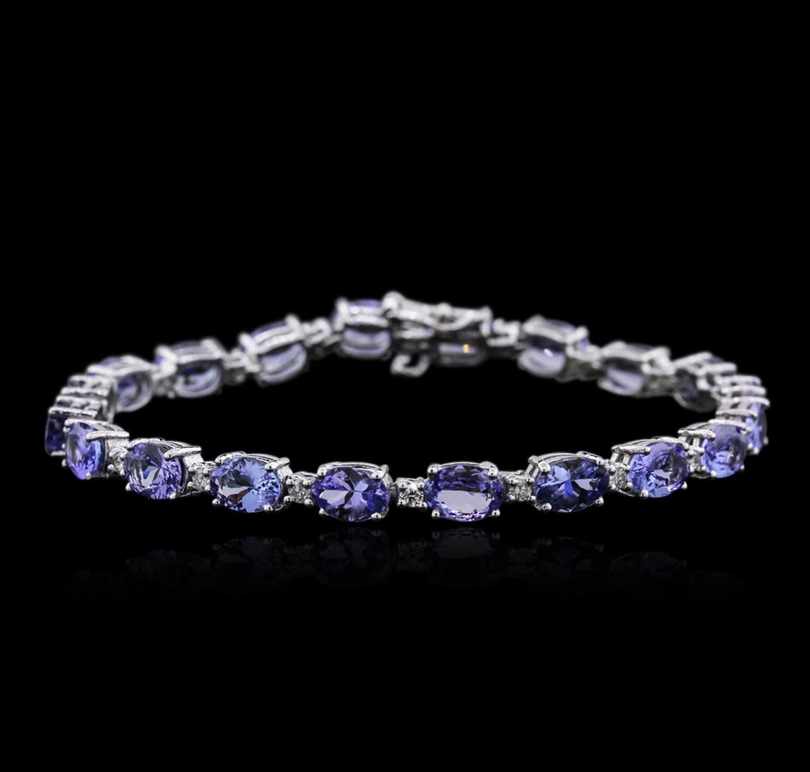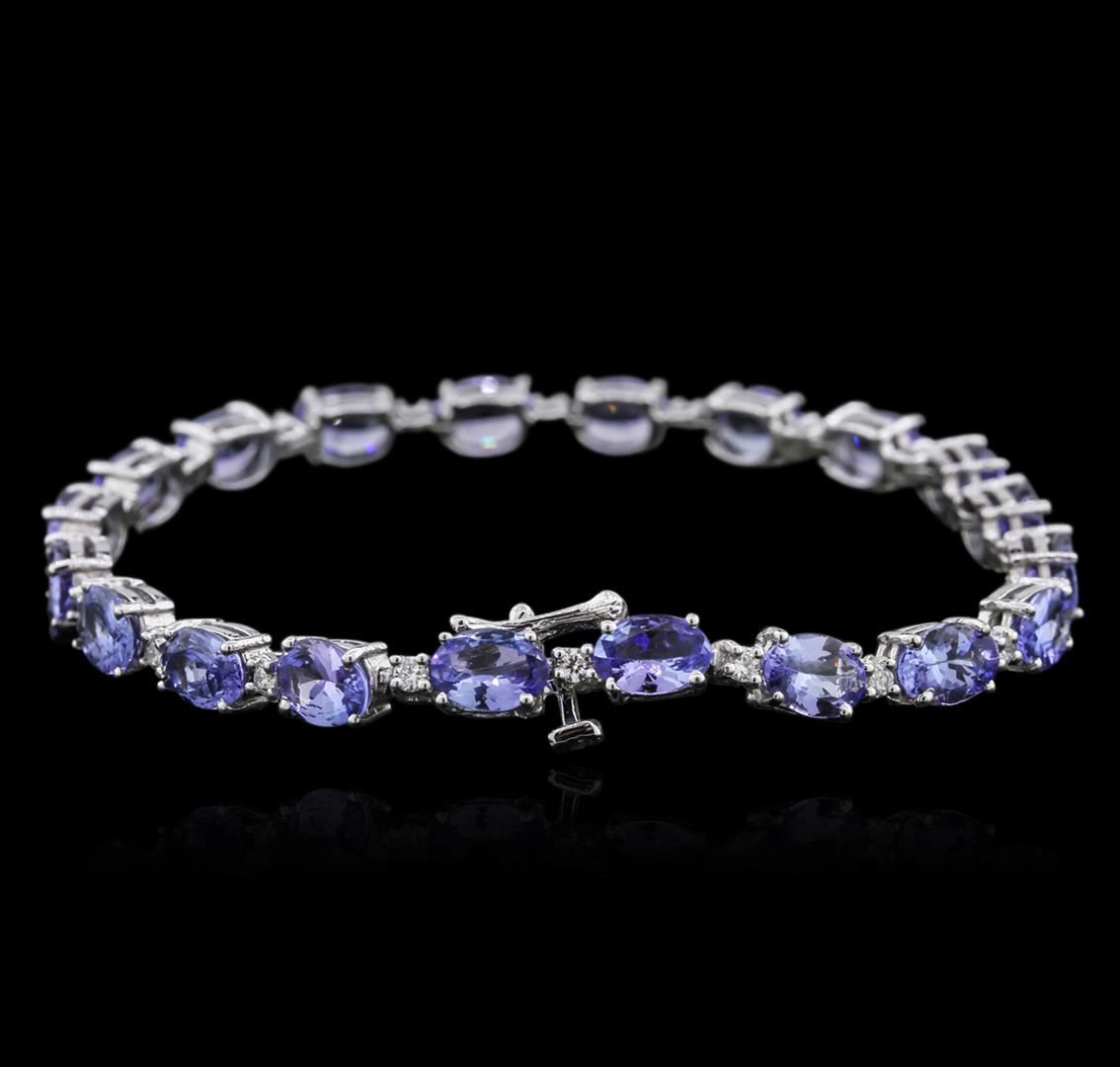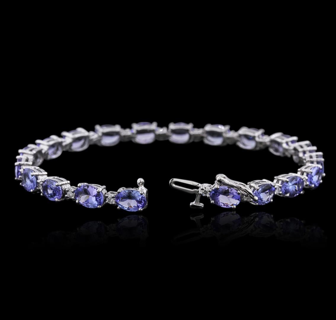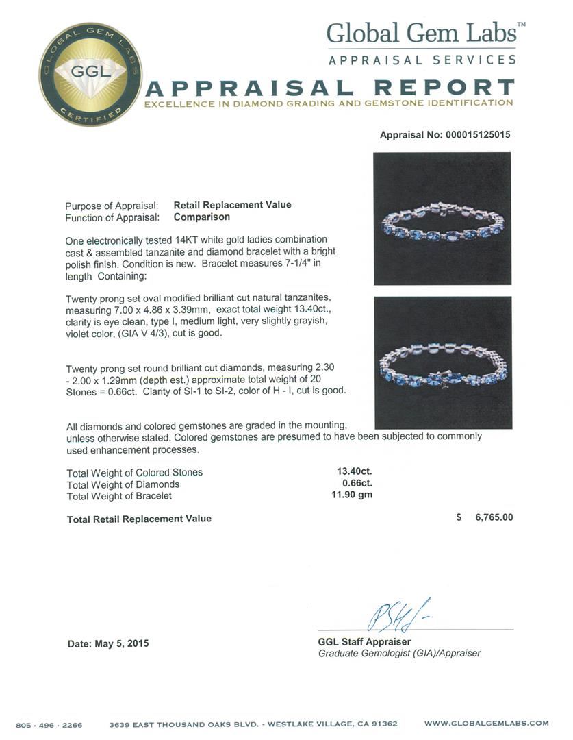 One electronically tested 14KT white gold ladies combination cast & assembled tanzanite and diamond bracelet with a bright polish finish. Bracelet measures 7-1/4" in length Condition is new. Containing: Twenty prong set oval modified brilliant cut natural tanzanites, measuring 7.00 x 4.86 x 3.39mm, exact total weight 13.40ct., clarity is eye clean, type I, medium light, very slightly grayish, violet color, (GIA V 4/3), cut is good. Twenty prong set round brilliant cut diamonds, measuring 2.30 - 2.00 x 1.29mm (depth est.) approximate total weight of 20 Stones = 0.66ct. Clarity: SI-1 to SI-2. Color: H - I, Cut is Good. All diamonds and colored gemstones are graded in the mounting, unless otherwise stated. Colored gemstones are presumed to have been subjected to commonly used enhancement processes.. Total Weight of Colored Stones 13.40ct. Total Weight of Diamonds 0.66ct. Total Weight of Bracelet 11.90 grams. GGL Appraised at $6,765.00.