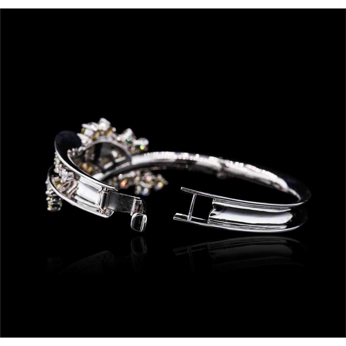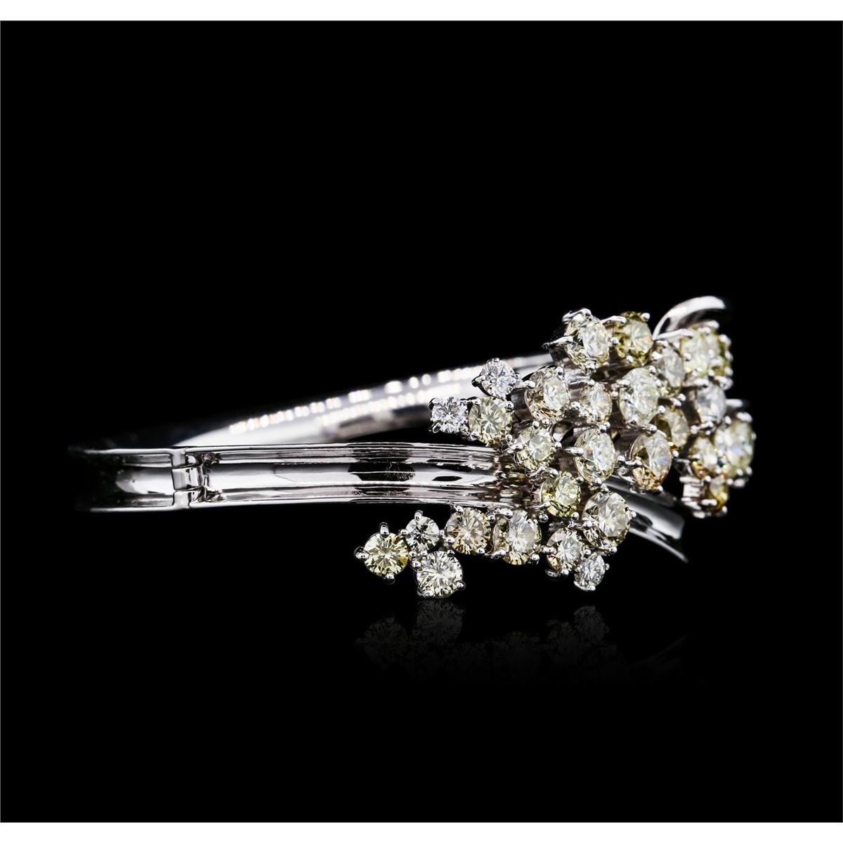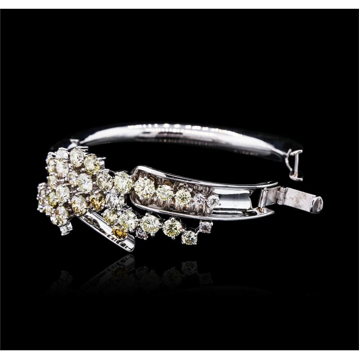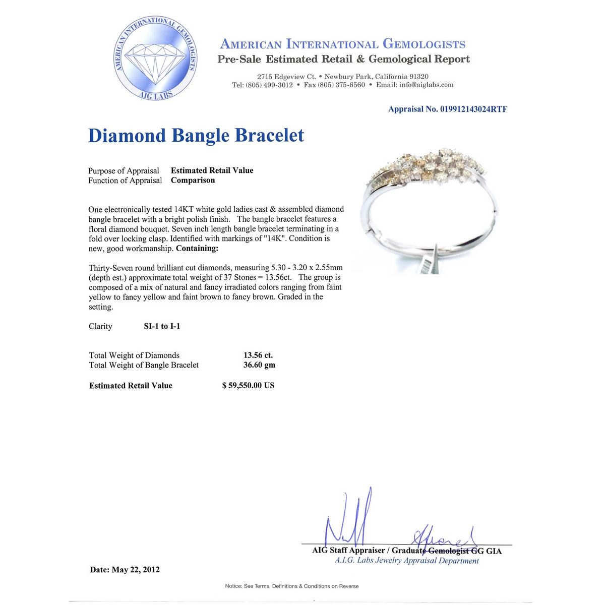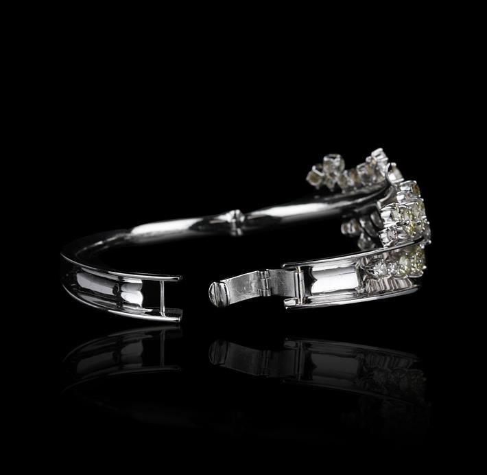 One electronically tested 14KT white gold ladies cast & assembled diamond bangle bracelet with a bright polish finish. The bangle bracelet features a floral diamond bouquet. Seven inch length bangle bracelet terminating in a fold over locking clasp. Identified with markings of "14K". Condition is new, good workmanship. Total weight of diamonds is 13.56ct. Total weight of bracelet is 36.60gm. AIG Appraised at $59,550.00.