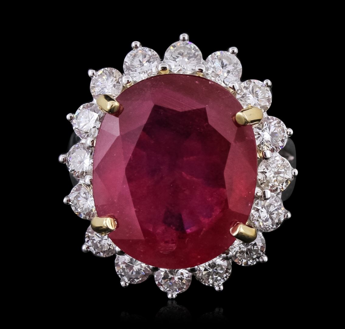 One electronically tested 14KT white gold ladies cast ruby and diamond ring. The featured ruby is set within a diamond bezel, completed by a three and one-half millimeter wide band. Bright polish finish with yellow gold accents. Identified with markings of "14K". Condition is new, good workmanship. Containing: One prong set oval mixed cut natural ruby, measuring 16.80 x 14.20 x 6.50mm, 10%. bulge factor, approximate weight of 13.74ct., clarity is heavily included, type II, medium dark, moderately strong, red color, (GIA R 6/4), cut is good. Transmitting light somewhat diffusely, transparent to translucent. Naturally occurring internal & external characteristics are present. Indications of laboratory high temperature heat treatment, with glass & flux additives. Graded in the setting. Ruby has a low tolerance to rhodium plating, repolishing the surface, & ultrasonic cleaning. Sixteen prong set round brilliant cut diamonds, measuring 3.30 - 3.20 x 1.95mm (depth est.) approximate total weight of 16 Stones = 2.11ct. Graded in the setting. Clarity: SI-2 to I-1. Color: G - I. Total Weight of Colored Stones 13.74ct. Total Weight of Diamonds 2.11ct. Total Weight of Ring 11.60 grams. AIG Appraised at $10,505.00.