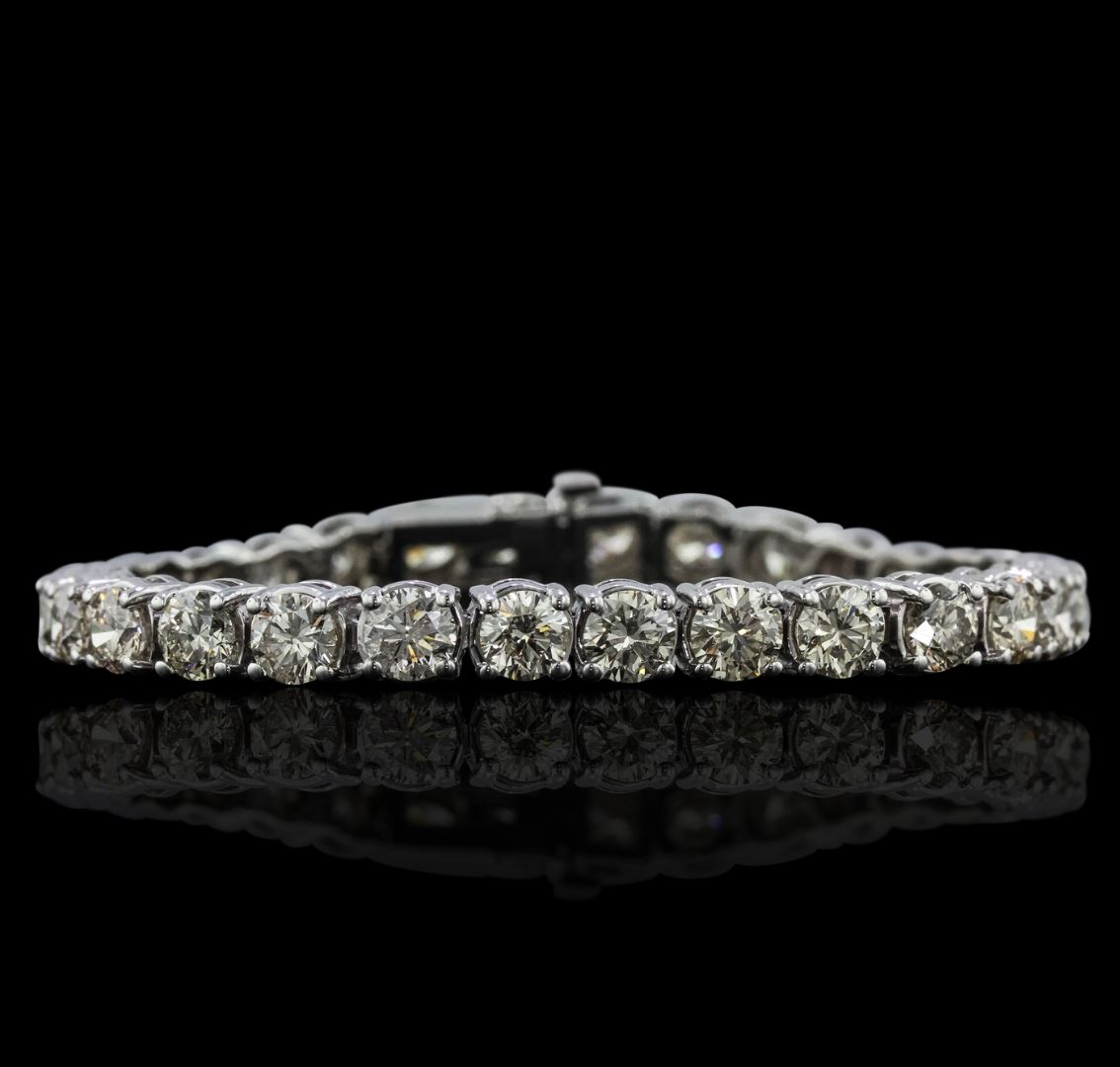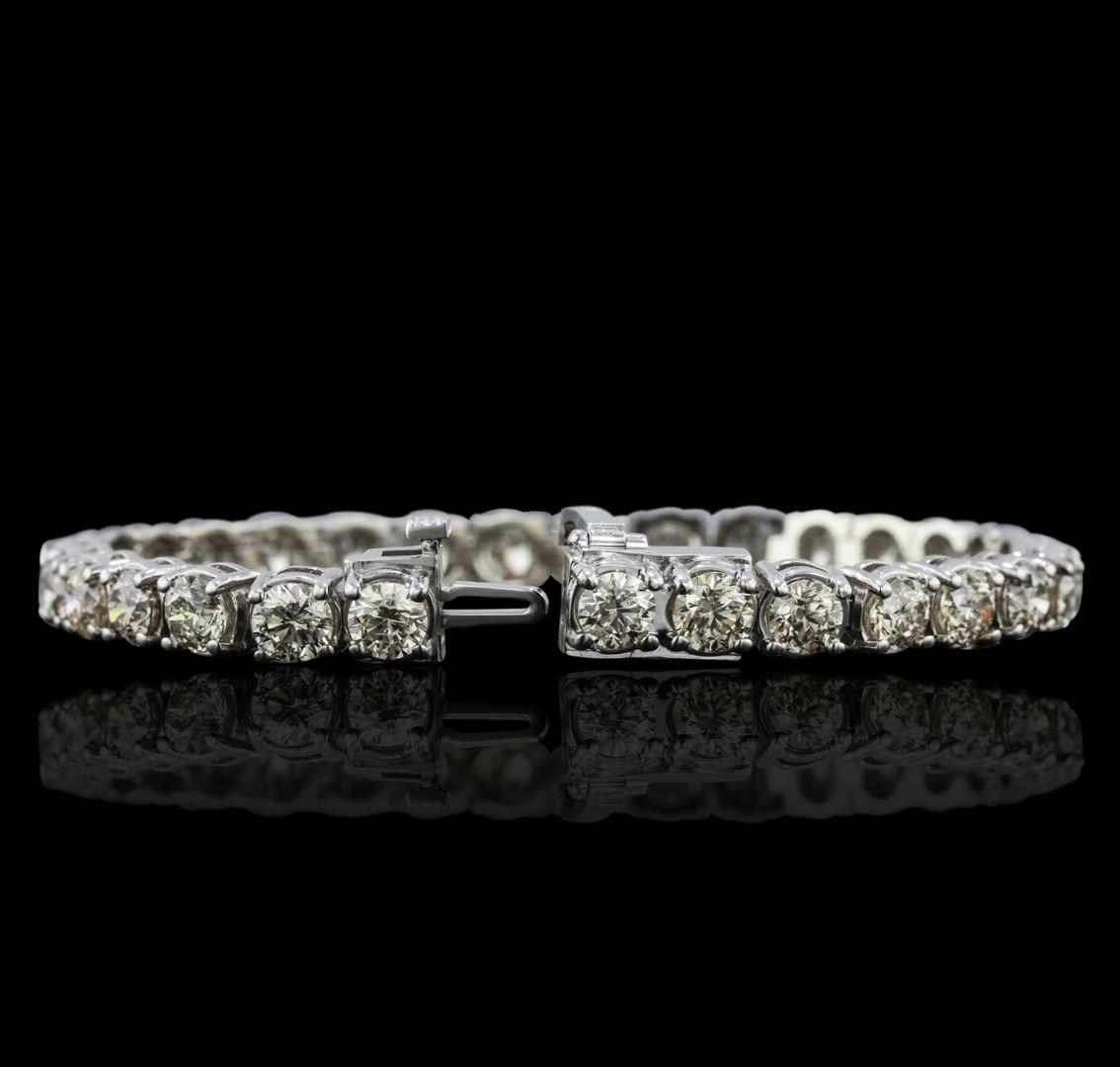 One electronically tested 14KT white gold ladies cast & assembled diamond tennis bracelet with a bright polish finish. Condition is new, good workmanship. Seven inch length bracelet composed of a flexible ribbon of diamonds, terminating in a concealed clasp with safety. Identified with markings of "14K". Tennis bracelets & necklaces got their unusual name from an incident involving the U.S. professional tennis player Chris Evert during a tennis match in the 1980's. Evert had been wearing an expensive diamond bracelet, an inline string of individually-set diamonds. Previously these bracelets were known as eternity bracelets. When the clasp snapped during play, she asked the officials to stop the tennis match until the bracelet could be found. Since that day, bracelets and necklaces featuring an inline string of diamonds have been called tennis bracelets and tennis necklaces. Containing: Thirty prong set round brilliant cut diamonds, measuring 5.00 - 4.90 x 3.05mm (depth est.) approximate. Total Weight of 30 Stones = 13.77ct. Color grade is an average for the group. Graded in the setting. Clarity: SI-1 to I-1. Total Weight of Diamonds 13.77ct. Total Weight of Tennis Bracelet 22.39 grams. AIG Appraised at $57,020.00.