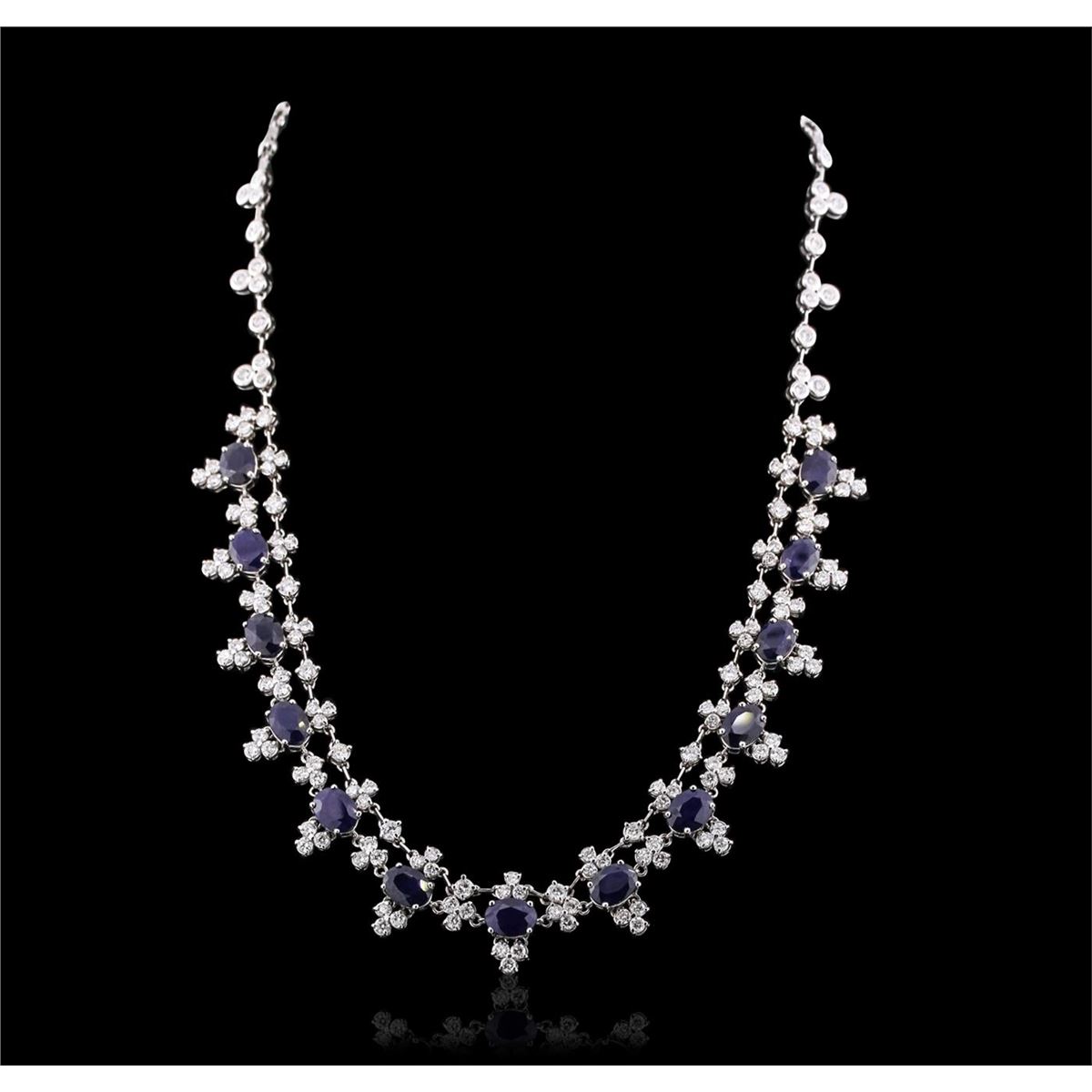 One electronically tested 14KT white gold ladies combination cast & assembled necklace with a hidden box clasp with a bright polish finish. Measurements: 16" in length. Identified with markings of "K14". Condition is new. Containing: Thirteen prong set oval modified brilliant cut natural blue sapphires, measuring 8.13 x 5.92 x 2.69mm, approximate total weight of 13.78ct., clarity is heavily included, type II, dark, moderately strong, blue color, (GIA B 7/4), cut is good. Eighty prong set round brilliant cut diamonds, measuring 2.50 - 1.80 x 1.29mm (depth est.) approximate total weight of 80 Stones = 2.90ct. Clarity: SI-1 to I-1. Color: H - J, Cut is Good. Colored gemstones are presumed to have been subjected to commonly used enhancement processes. All diamonds and colored gemstones are graded in the mounting, unless otherwise stated. Total Weight of Colored Stones 13.78ct. Total Weight of Diamonds 2.90ct. Total Weight of Necklace 37.30 grams. GGL Appraised at $25,040.00.