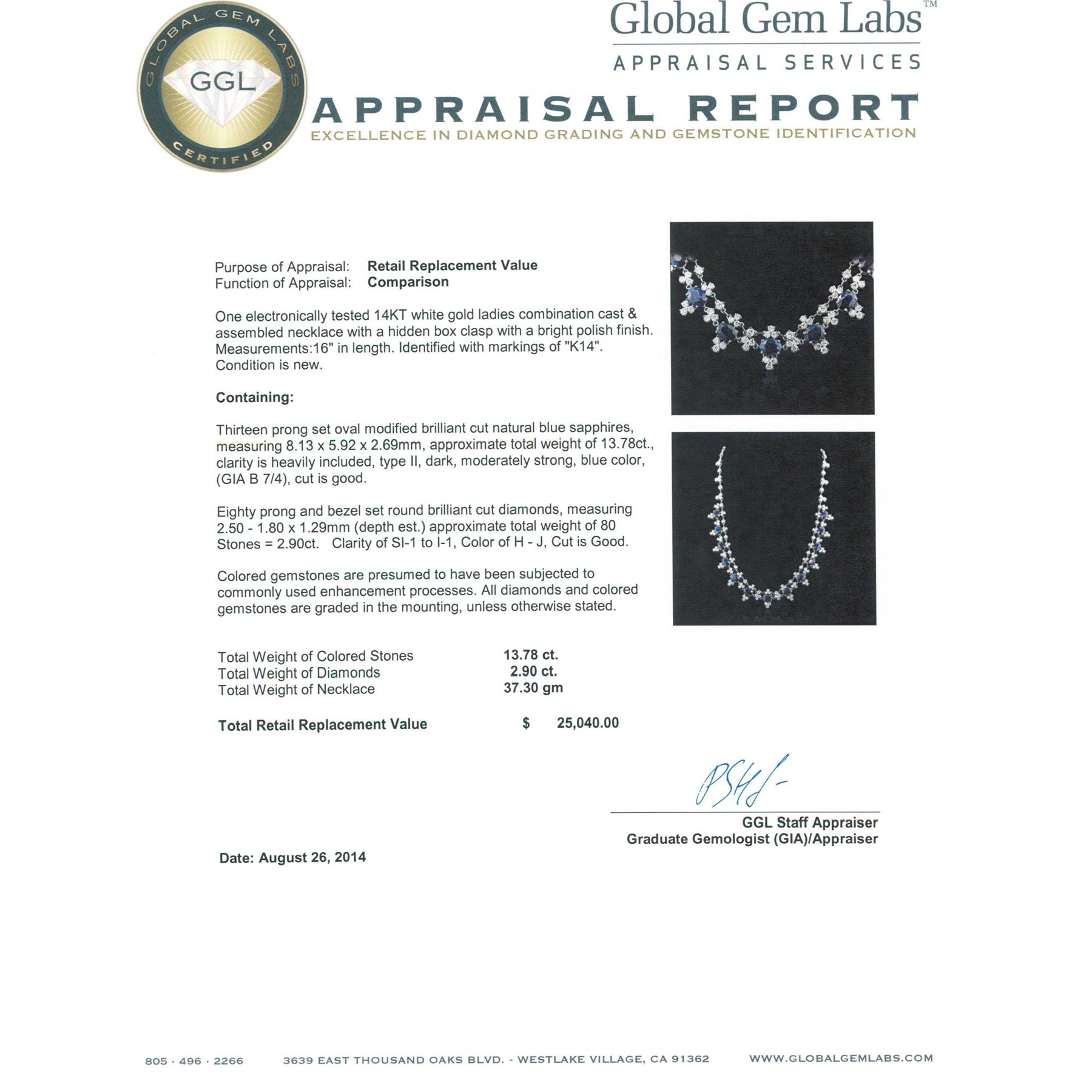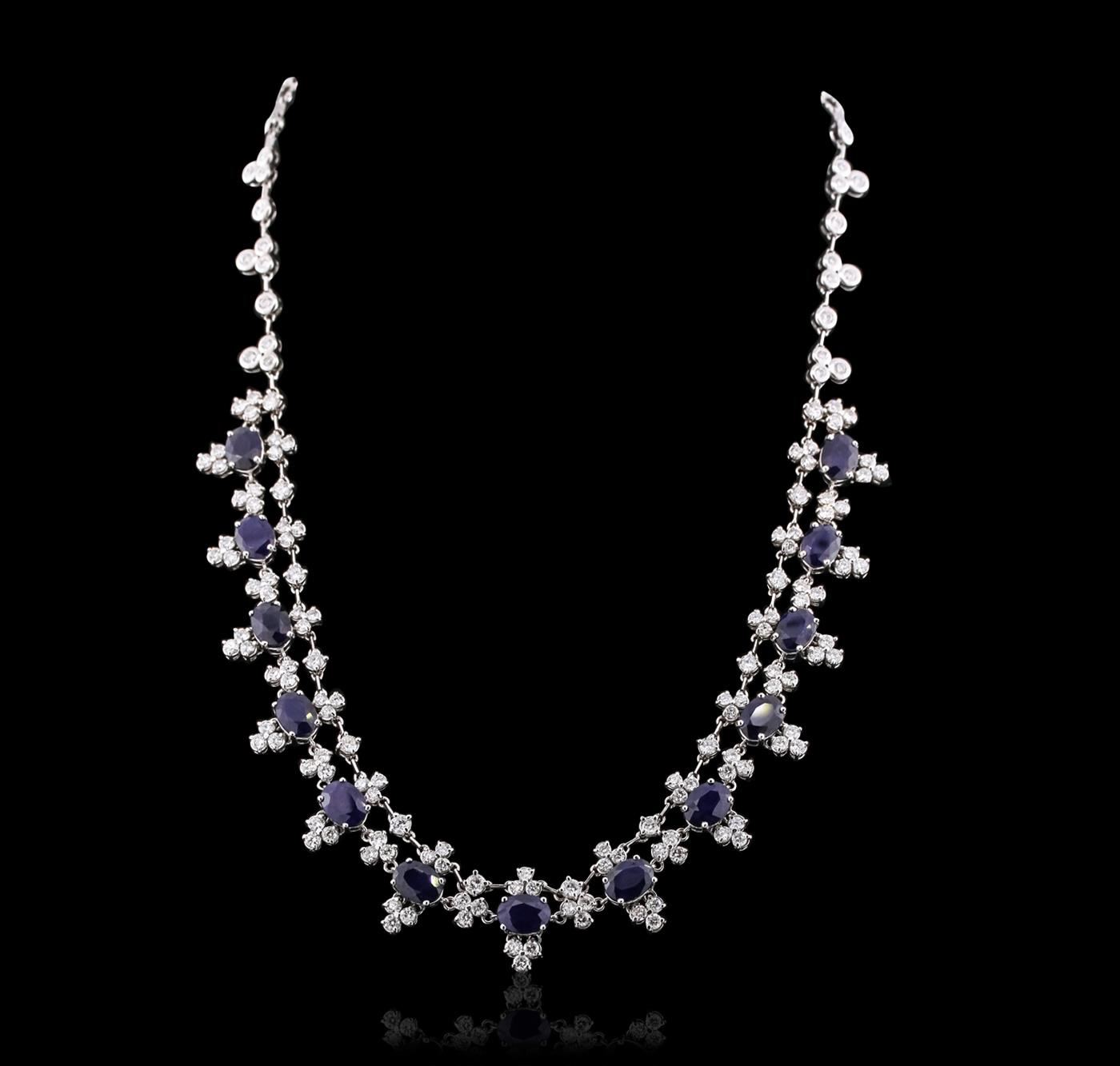 One electronically tested 14KT white gold ladies combination cast & assembled necklace with a hidden box clasp with a bright polish finish. Measurements: 16" in length. Identified with markings of "K14". Condition is new. Containing: Thirteen prong set oval modified brilliant cut natural blue sapphires, measuring 8.13 x 5.92 x 2.69mm, approximate total weight of 13.78ct., clarity is heavily included, type II, dark, moderately strong, blue color, (GIA B 7/4), cut is good. Eighty prong set round brilliant cut diamonds, measuring 2.50 - 1.80 x 1.29mm (depth est.) approximate total weight of 80 Stones = 2.90ct. Clarity: SI-1 to I-1. Color: H - J, Cut is Good. Colored gemstones are presumed to have been subjected to commonly used enhancement processes. All diamonds and colored gemstones are graded in the mounting, unless otherwise stated. Total Weight of Colored Stones 13.78ct. Total Weight of Diamonds 2.90ct. Total Weight of Necklace 37.30 grams. GGL Appraised at $25,040.00.