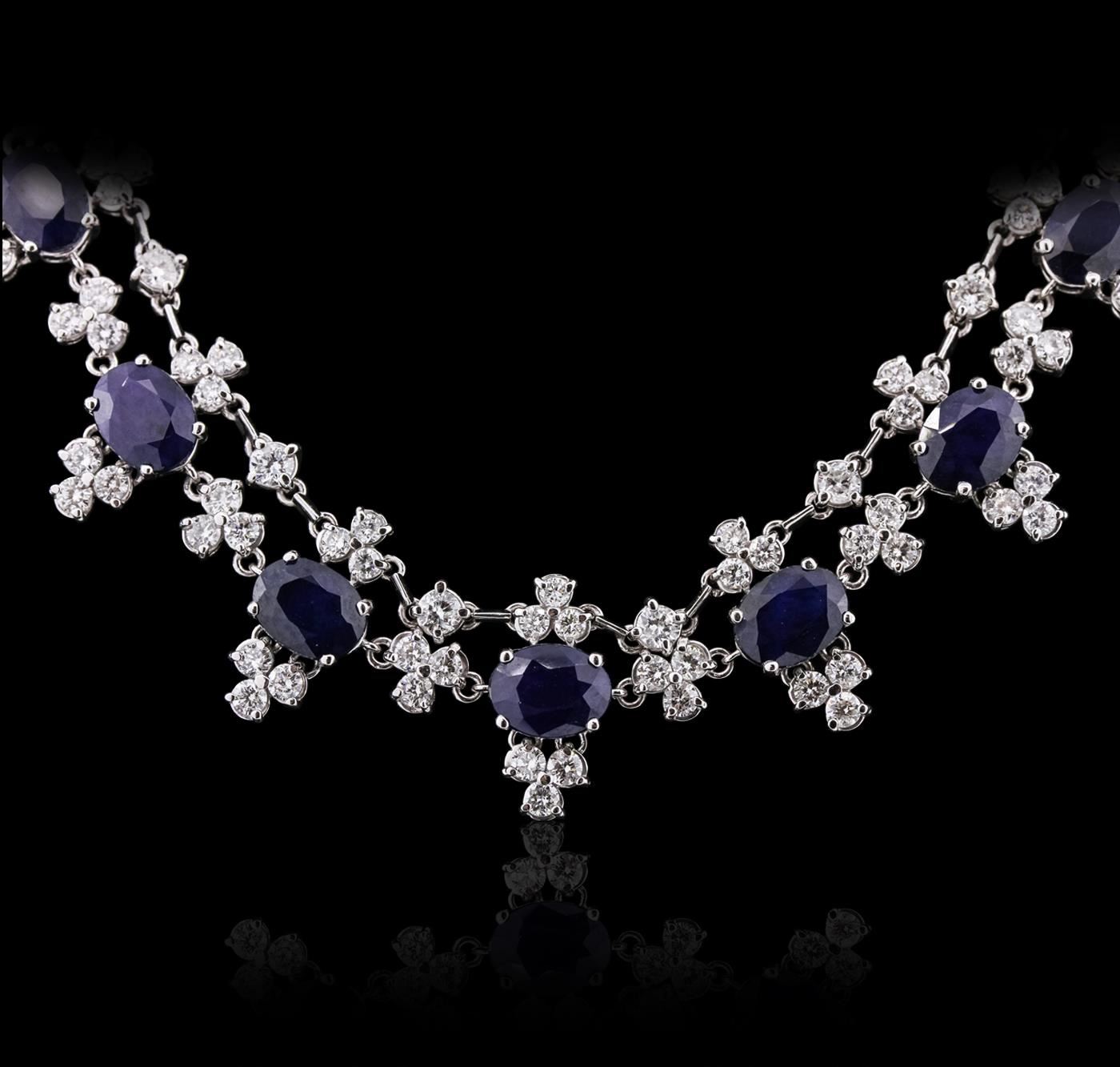 One electronically tested 14KT white gold ladies combination cast & assembled necklace with a hidden box clasp with a bright polish finish. Measurements: 16" in length. Identified with markings of "K14". Condition is new. Containing: Thirteen prong set oval modified brilliant cut natural blue sapphires, measuring 8.13 x 5.92 x 2.69mm, approximate total weight of 13.78ct., clarity is heavily included, type II, dark, moderately strong, blue color, (GIA B 7/4), cut is good. Eighty prong set round brilliant cut diamonds, measuring 2.50 - 1.80 x 1.29mm (depth est.) approximate total weight of 80 Stones = 2.90ct. Clarity: SI-1 to I-1. Color: H - J, Cut is Good. Colored gemstones are presumed to have been subjected to commonly used enhancement processes. All diamonds and colored gemstones are graded in the mounting, unless otherwise stated. Total Weight of Colored Stones 13.78ct. Total Weight of Diamonds 2.90ct. Total Weight of Necklace 37.30 grams. GGL Appraised at $25,040.00.