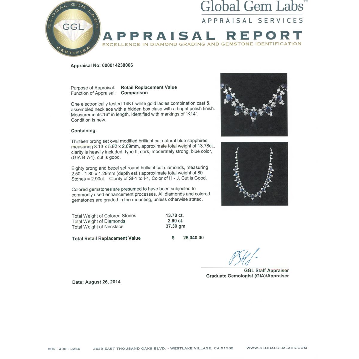 One electronically tested 14KT white gold ladies combination cast & assembled necklace with a hidden box clasp with a bright polish finish. Measurements: 16" in length. Identified with markings of "K14". Condition is new. Containing: Thirteen prong set oval modified brilliant cut natural blue sapphires, measuring 8.13 x 5.92 x 2.69mm, approximate total weight of 13.78ct., clarity is heavily included, type II, dark, moderately strong, blue color, (GIA B 7/4), cut is good. Eighty prong set round brilliant cut diamonds, measuring 2.50 - 1.80 x 1.29mm (depth est.) approximate total weight of 80 Stones = 2.90ct. Clarity: SI-1 to I-1. Color: H - J, Cut is Good. Colored gemstones are presumed to have been subjected to commonly used enhancement processes. All diamonds and colored gemstones are graded in the mounting, unless otherwise stated. Total Weight of Colored Stones 13.78ct. Total Weight of Diamonds 2.90ct. Total Weight of Necklace 37.30 grams. GGL Appraised at $25,040.00.
