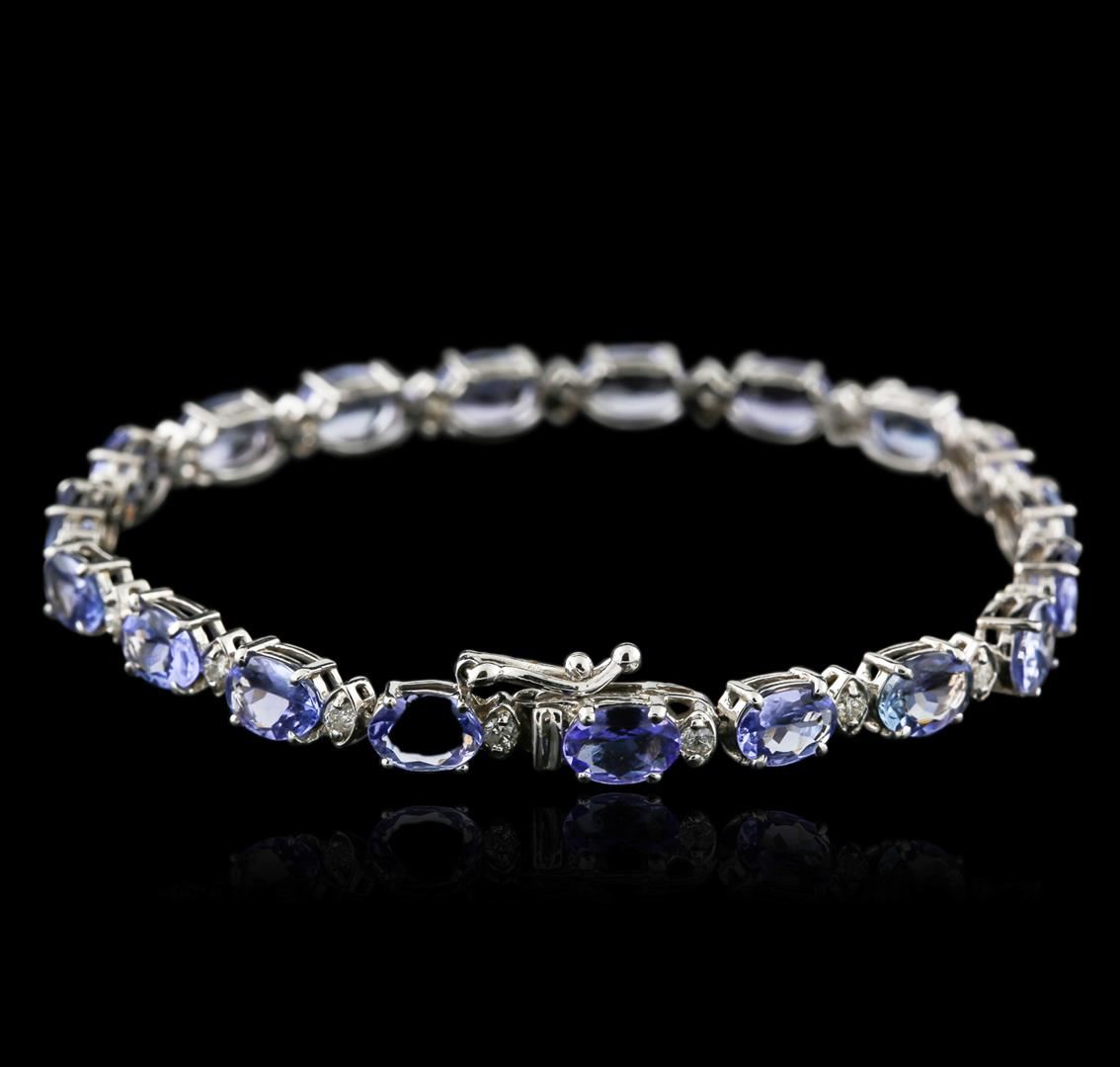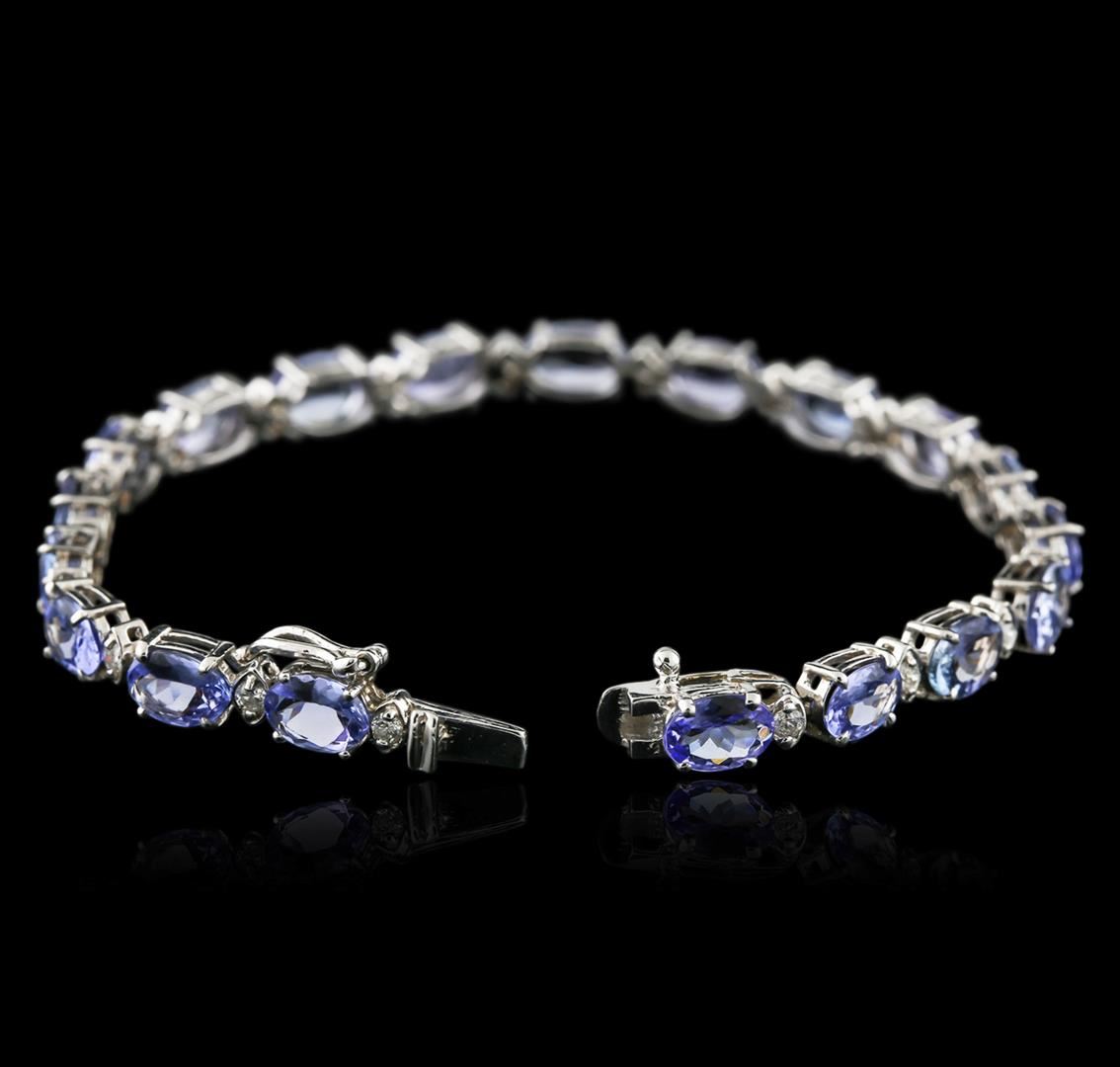 One bracelet featuring: Metal: 14k Solid White Gold. Face Measurements: 5 x 180mm. Size: 7.25. Finish: Bright Polish. Total Item Weight: 10 grams. Markings: Stamped 14K. Country Made: USA. Main Stone: Tanzanite. Quantity: 19. Shape: Oval. Color: Blue. Carat Total Weight: 14. Measurements: 5 x 7mm. Treatment: None. Setting: Prong. Hue: Blue. Saturation: Moderately Strong. Tone: Light. Clarity: Type 2. Cut: Very Good. Secondary Stone: Diamond. Quantity: 19. Shape: Round. Color: White. Carat Total Weight: 0.60. Measurements: 1.8mm. Treatment: None. Setting: Prong. Color Grade: H - I. Clarity: SI1 - SI2. Cut: Very Good. Excellent Workmanship. Gemstones graded in the mounting. Beverly Hills Gemological Lab at $11,300.00.