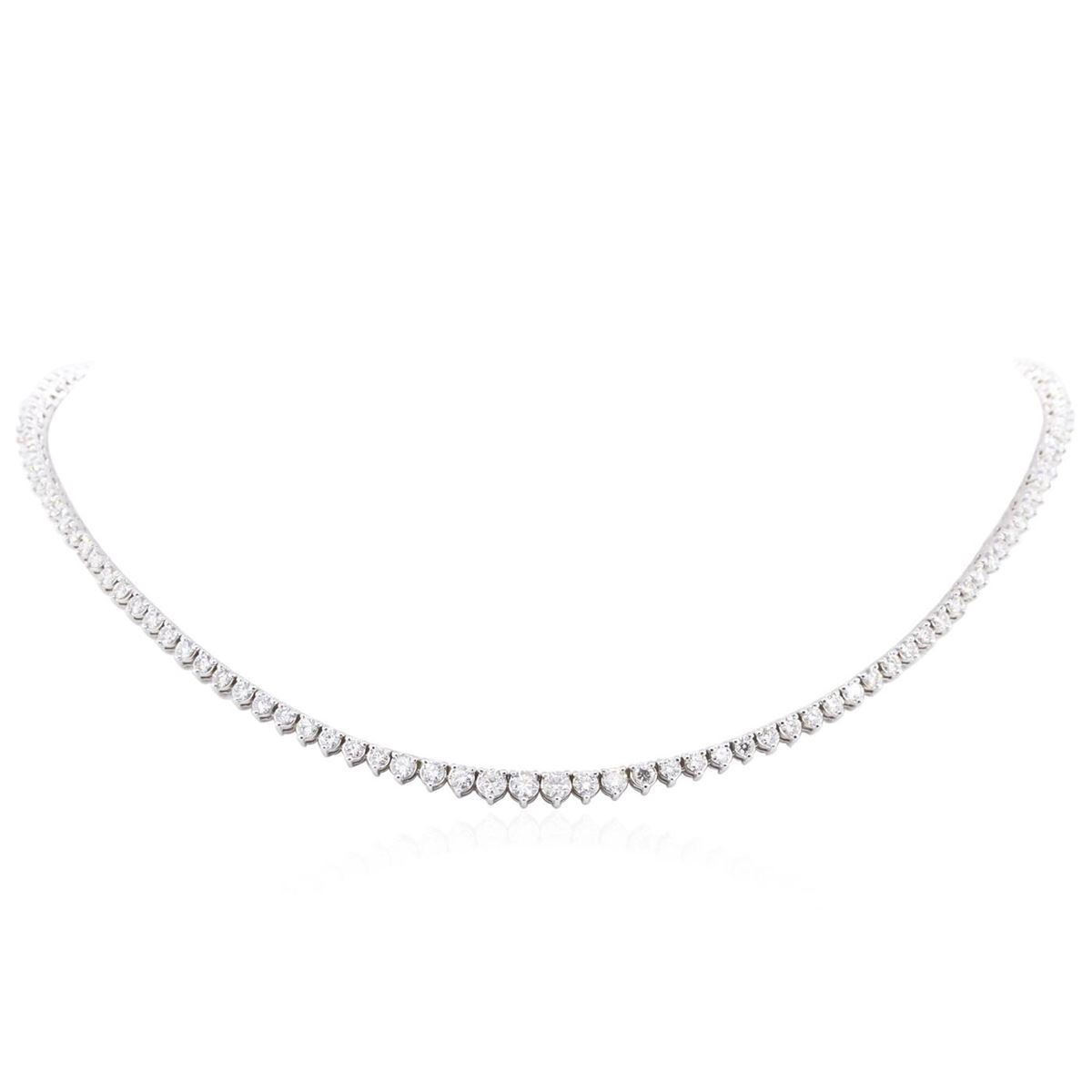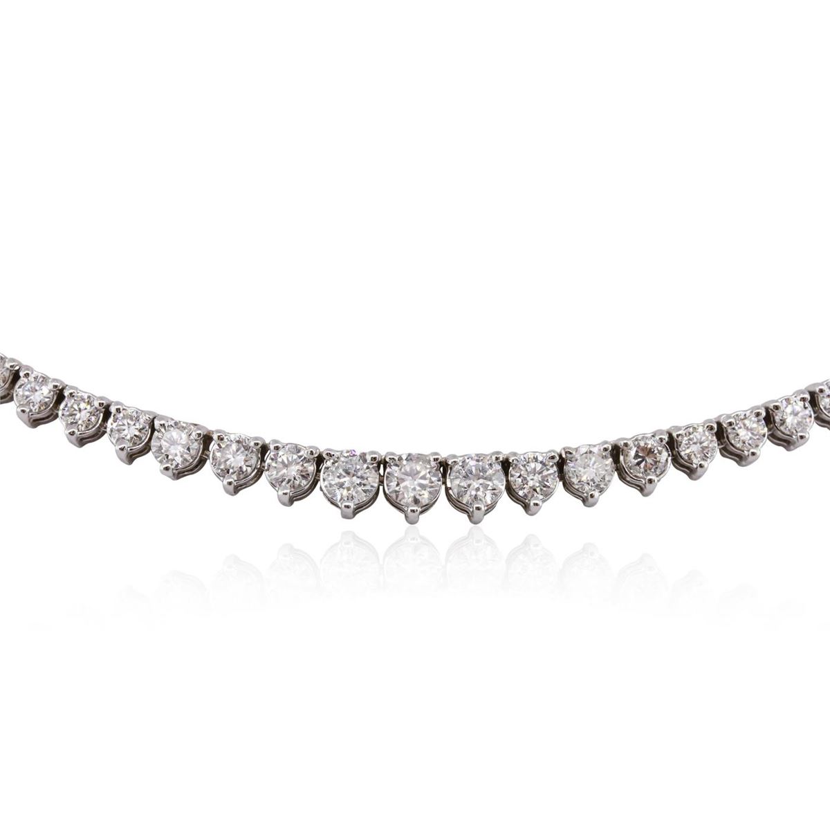 One electronically tested 14KT white gold ladies combination cast & assembled diamond necklace with a hidden box clasp with safety closer with a bright polish finish. Measurements: 17 in length. Identified with markings of 14K. Condition is new. Containing: One Hundred Forty-Two prong set round brilliant cut diamonds, measuring 4.00 - 2.00 x 1.80mm (depth est.) approximate total weight of 142 Stones = 14.03ct. Clarity: SI-2 to I-2. Color: H - J, Cut is Good. All diamonds are graded in the mounting, unless otherwise stated. Total Weight of Diamonds 14.03ct. Total Weight of Necklace 26.30 grams. GGL Appraised at $29,570.00.