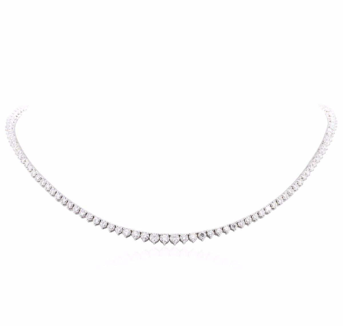 One electronically tested 14KT white gold ladies combination cast & assembled diamond necklace with a hidden box clasp with safety closer with a bright polish finish. Measurements: 17 in length. Identified with markings of 14K. Condition is new. Containing: One Hundred Forty-Two prong set round brilliant cut diamonds, measuring 4.00 - 2.00 x 1.80mm (depth est.) approximate total weight of 142 Stones = 14.03ct. Clarity: SI-2 to I-2. Color: H - J, Cut is Good. All diamonds are graded in the mounting, unless otherwise stated. Total Weight of Diamonds 14.03ct. Total Weight of Necklace 26.30 grams. GGL Appraised at $29,570.00.