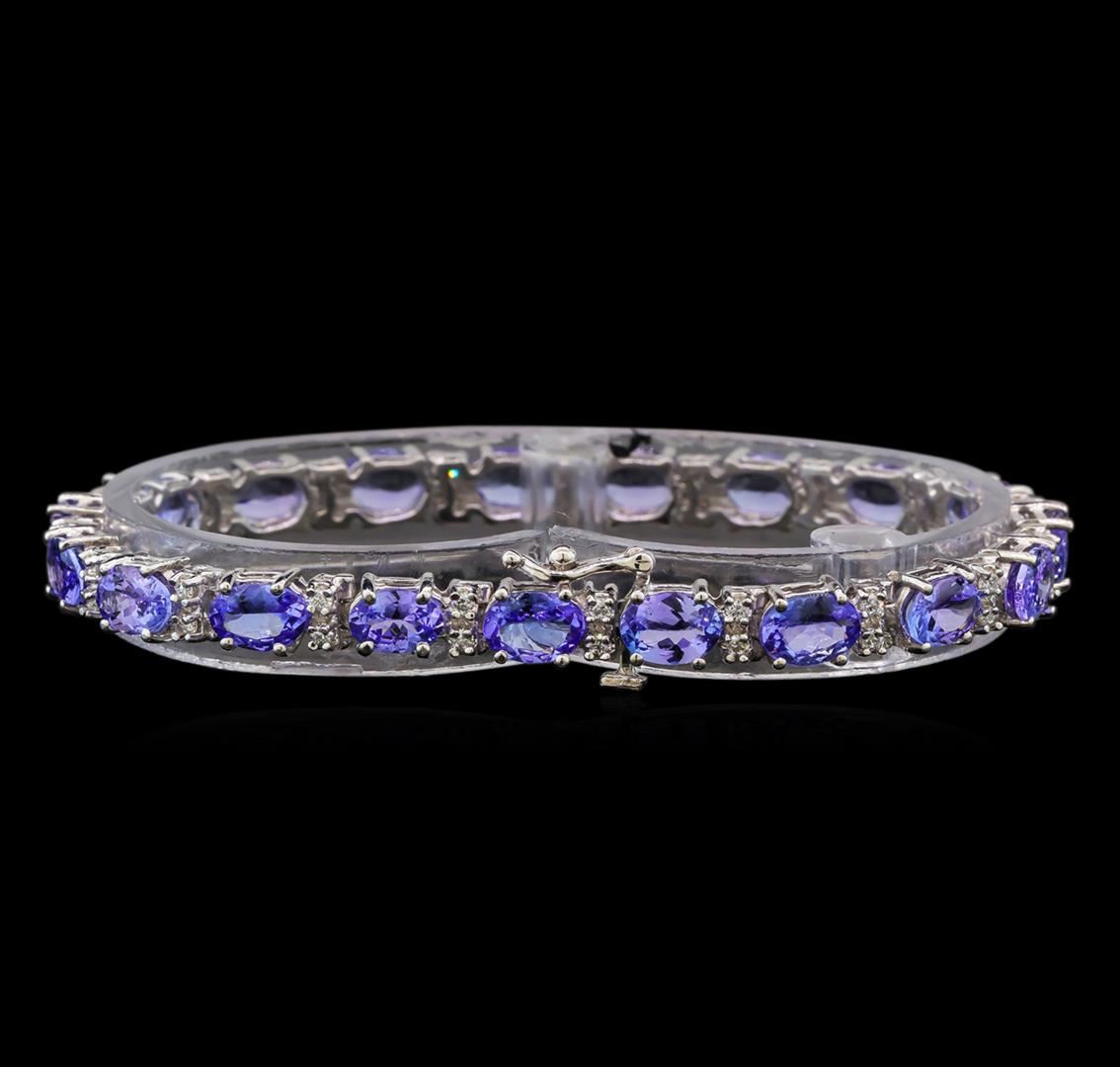 One electronically tested 14KT white gold ladies cast tanzanite and diamond bracelet with a hidden box clasp with safety closer with a bright polish finish. Measurements: 7" in length. Identified with markings of "14K". Condition is new. Containing: Nineteen prong set oval modified brilliant cut natural tanzanites, measuring 6.70 x 4.90 x 3.19mm, approximate total weight of 14.06ct., clarity is eye clean, type I, medium light, very slightly grayish, violet color, (GIA V 4/3), cut is good. Thirty-Eight prong set round brilliant cut diamonds, measuring 1.30 - 1.30 x 0.78mm (depth est.) approximate total weight of 38 Stones = 0.30ct. Clarity: SI-1 to SI-2. Color: I - J, Cut is Good. Colored gemstones are presumed to have been subjected to commonly used enhancement processes. All diamonds and colored gemstones are graded in the mounting, unless otherwise stated. Total Weight of Colored Stones 14.06ct. Total Weight of Diamonds 0.30ct. Total Weight of Bracelet 14.30 grams. GGL Appraised at $5,150.00.