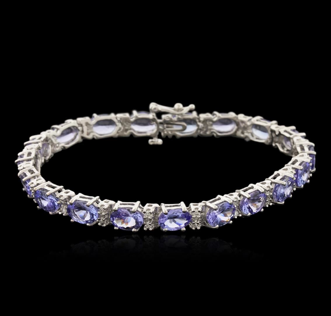 One electronically tested 14KT white gold ladies cast tanzanite and diamond bracelet with a hidden box clasp with safety closer with a bright polish finish. Measurements: 7" in length. Identified with markings of "14K". Condition is new. Containing: Nineteen prong set oval modified brilliant cut natural tanzanites, measuring 6.70 x 4.90 x 3.19mm, approximate total weight of 14.06ct., clarity is eye clean, type I, medium light, very slightly grayish, violet color, (GIA V 4/3), cut is good. Thirty-Eight prong set round brilliant cut diamonds, measuring 1.30 - 1.30 x 0.78mm (depth est.) approximate total weight of 38 Stones = 0.30ct. Clarity: SI-1 to SI-2. Color: I - J, Cut is Good. Colored gemstones are presumed to have been subjected to commonly used enhancement processes. All diamonds and colored gemstones are graded in the mounting, unless otherwise stated. Total Weight of Colored Stones 14.06ct. Total Weight of Diamonds 0.30ct. Total Weight of Bracelet 14.30 grams. GGL Appraised at $5,150.00.
