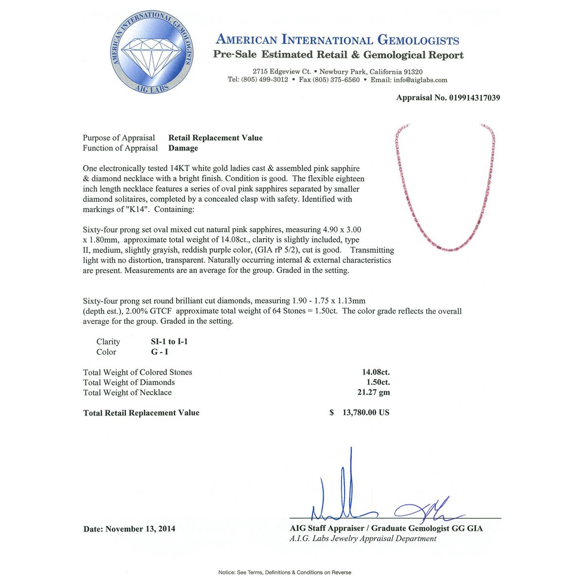 One electronically tested 14KT white gold ladies cast & assembled pink sapphire & diamond necklace with a bright finish. The flexible eighteen inch length necklace features a series of oval pink sapphires separated by smaller diamond solitaires, completed by a concealed clasp with safety. Identified with markings of "K14". Condition is good. Containing: Sixty-four prong set oval mixed cut natural pink sapphires, measuring 4.90 x 3.00 x 1.80mm, approximate total weight of 14.08ct., clarity is slightly included, type II, medium, slightly grayish, reddish purple color, (GIA rP 5/2), cut is good. Transmitting light with no distortion, transparent. Naturally occurring internal & external characteristics are present. Measurements are an average for the group. Graded in the setting. Sixty-Four prong set round brilliant cut diamonds, measuring 1.90 - 1.75 x 1.13mm (depth est.), 2.00% GTCF approximate total weight of 64 Stones = 1.50ct. The color grade reflects the overall average for the group. Graded in the setting. Clarity SI-1 to I-1. Color G - I. Total Weight of Colored Stones 14.08ct. Total Weight of Diamonds 1.50ct. Total Weight of Necklace 21.27 grams. AIG Appraised at $13,780.00.