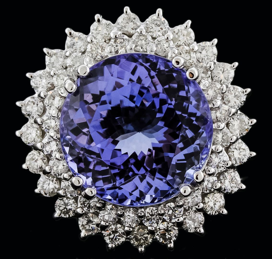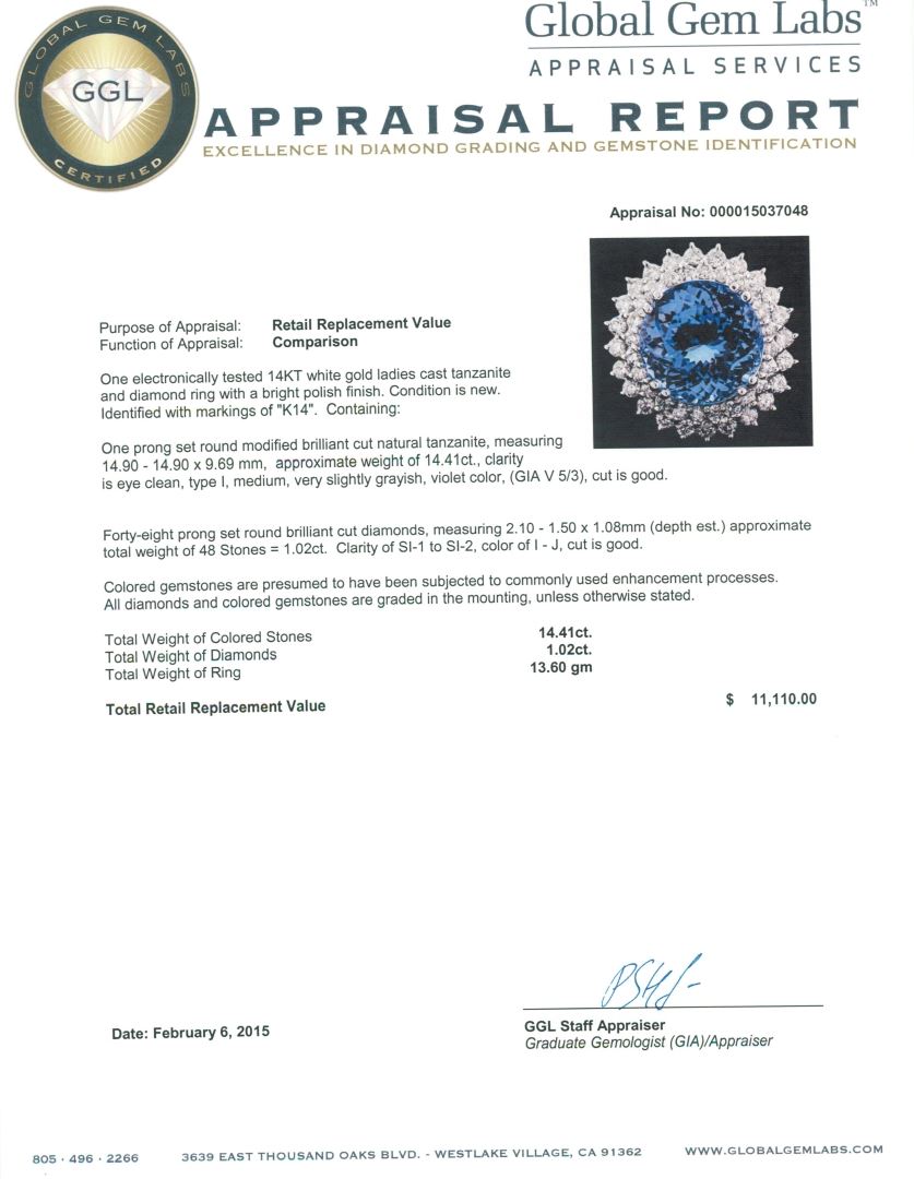 One electronically tested 14KT white gold ladies cast tanzanite and diamond ring with a bright polish finish. Identified with markings of "K14". Condition is new. Containing: One prong set round modified brilliant cut natural tanzanite, measuring 14.90 - 14.90 x 9.69 mm, approximate weight of 14.41ct., clarity is eye clean, type I, medium, very slightly grayish, violet color, (GIA V 5/3), cut is good. Forty-Eight prong set round brilliant cut diamonds, measuring 2.10 - 1.50 x 1.08mm (depth est.) approximate. Total Weight of 48 Stones = 1.02ct. Clarity: SI-1 to SI-2. Color: I - J, Cut is Good. Colored gemstones are presumed to have been subjected to commonly used enhancement processes. All diamonds and colored gemstones are graded in the mounting, unless otherwise stated. Total Weight of Colored Stones 14.41ct. Total Weight of Diamonds 1.02ct. Total Weight of Ring 13.60 grams. GGL Appraised at $11,110.00.