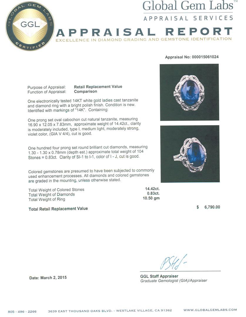 One electronically tested 14KT white gold ladies cast tanzanite and diamond ring with a bright polish finish. Identified with markings of "14K". Condition is new. Containing: One prong set oval cabochon cut natural tanzanite, measuring 16.90 x 12.05 x 7.83mm, approximate weight of 14.42ct., clarity is moderately included, type I, medium light, moderately strong, violet color, (GIA V 4/4), cut is good. One Hundred Four prong set round brilliant cut diamonds, measuring 1.30 - 1.30 x 0.78mm (depth est.) approximate total weight of 104 Stones = 0.83ct. Clarity: SI-1 to I-1. Color: I - J, Cut is Good. Colored gemstones are presumed to have been subjected to commonly used enhancement processes. All diamonds and colored gemstones are graded in the mounting, unless otherwise stated. Total Weight of Colored Stones 14.42ct. Total Weight of Diamonds 0.83ct. Total Weight of Ring 10.50 grams. GGL Appraised at $6,790.00.