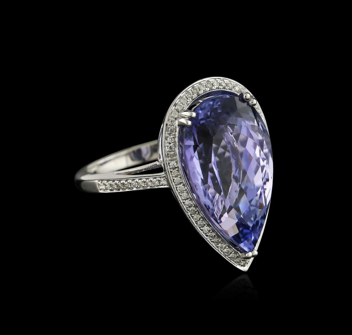 One electronically tested 14KT white gold ladies cast tanzanite and diamond ring with a bright polish finish. Identified with markings of "14K". Condition is new. Containing: One prong set pear modified brilliant cut natural tanzanite, measuring 19.00 x 12.00 x 9.50mm, approximate weight of 14.51ct., clarity is eye clean, type I, medium light, very slightly grayish, violet color, (GIA V 4/3), cut is good. Seventy-Six prong set round brilliant cut diamonds, measuring 1.00 - 1.00 x 0.60mm (depth est.) approximate total weight of 76 Stones = 0.20 ct. Clarity: I-1 to I-2. Color: I - J, Cut is Good. Diamonds and colored gemstones are graded in the mounting, unless otherwise stated. Colored gemstones are presumed to have been subjected to commonly used enhancement processes.. Total Weight of Colored Stones 14.51ct. Total Weight of Diamonds 0.20 ct. Total Weight of Ring 7.10 grams. GGL Appraised.