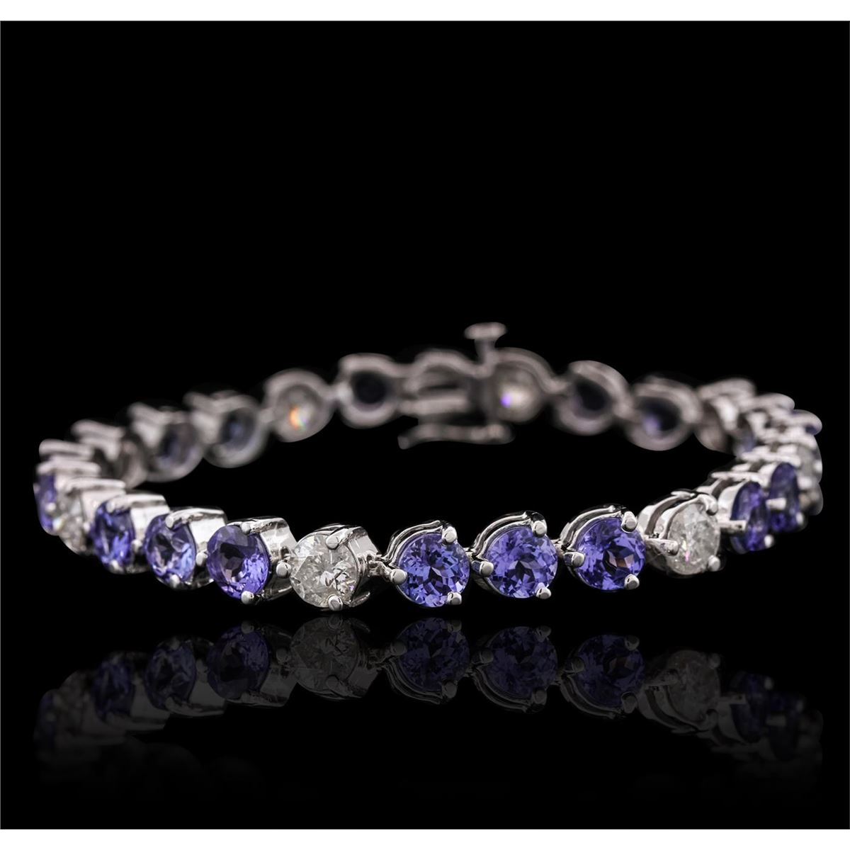 One electronically tested 14KT white gold ladies combination cast & assembled tennis bracelet with a hidden box clasp with a bright polish finish. Measurements: 6" in length. Identified with markings of "14K". Condition is new. Containing: Eighteen prong set round modified brilliant cut natural tanzanites, measuring 5.70 - 5.70 x 3.71 mm, approximate total weight of 14.58ct., clarity is eye clean, type I, medium, moderately strong, bluish violet color, (GIA bV 5/4), cut is good. Eight prong set round brilliant cut diamonds, measuring 5.50 - 5.50 x 3.30mm (depth est.) approximate total weight of 8 Stones = 4.87ct. Clarity: I-2 to I-3. Color: H - I, Cut is Good. Colored gemstones are presumed to have been subjected to commonly used enhancement processes. All diamonds and colored gemstones are graded in the mounting, unless otherwise stated. Total Weight of Colored Stones 14.58ct. Total Weight of Diamonds 4.87ct. Total Weight of Bracelet 20.30 grams. GGL Appraised at $17,850.00.