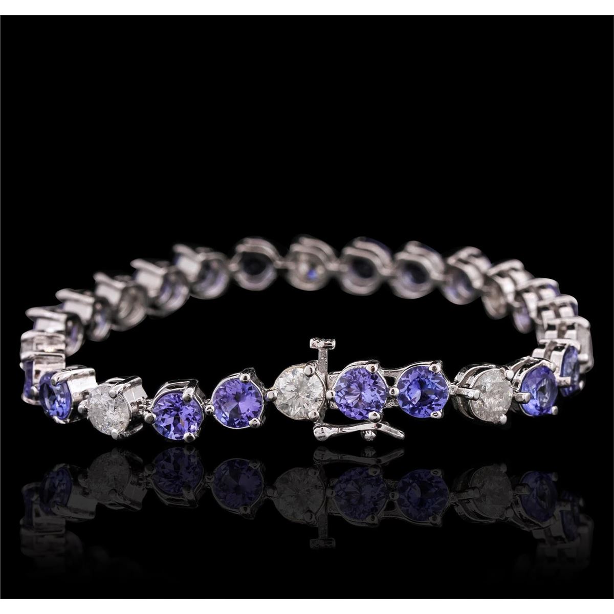 One electronically tested 14KT white gold ladies combination cast & assembled tennis bracelet with a hidden box clasp with a bright polish finish. Measurements: 6" in length. Identified with markings of "14K". Condition is new. Containing: Eighteen prong set round modified brilliant cut natural tanzanites, measuring 5.70 - 5.70 x 3.71 mm, approximate total weight of 14.58ct., clarity is eye clean, type I, medium, moderately strong, bluish violet color, (GIA bV 5/4), cut is good. Eight prong set round brilliant cut diamonds, measuring 5.50 - 5.50 x 3.30mm (depth est.) approximate total weight of 8 Stones = 4.87ct. Clarity: I-2 to I-3. Color: H - I, Cut is Good. Colored gemstones are presumed to have been subjected to commonly used enhancement processes. All diamonds and colored gemstones are graded in the mounting, unless otherwise stated. Total Weight of Colored Stones 14.58ct. Total Weight of Diamonds 4.87ct. Total Weight of Bracelet 20.30 grams. GGL Appraised at $17,850.00.