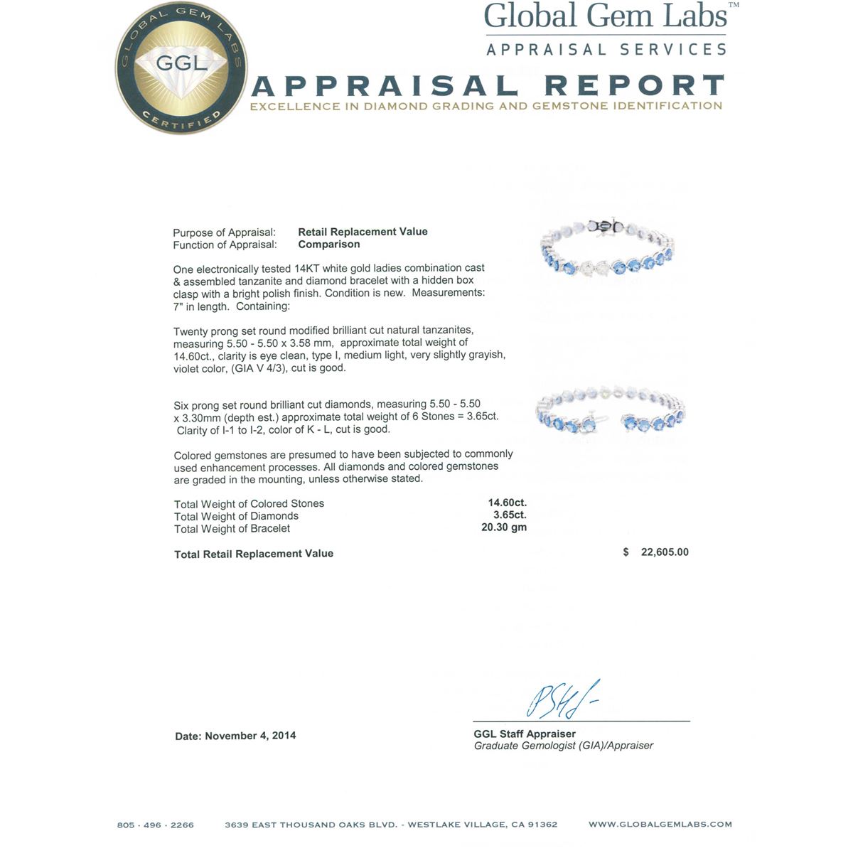 One electronically tested 14KT white gold ladies combination cast & assembled tanzanite and diamond bracelet with a hidden box clasp with a bright polish finish. Measurements: 7" in length. Condition is new. Containing: Twenty prong set round modified brilliant cut natural tanzanites, measuring 5.50 - 5.50 x 3.58 mm, approximate total weight of 14.60ct., clarity is eye clean, type I, medium light, very slightly grayish, violet color, (GIA V 4/3), cut is good. Six prong set round brilliant cut diamonds, measuring 5.50 - 5.50 x 3.30mm (depth est.) approximate total weight of 6 Stones = 3.65ct. Clarity: I-1 to I-2. Color: K - L, Cut is Good. Colored gemstones are presumed to have been subjected to commonly used enhancement processes. All diamonds and colored gemstones are graded in the mounting, unless otherwise stated. Total Weight of Colored Stones 14.60ct. Total Weight of Diamonds 3.65ct. Total Weight of Bracelet 20.30 grams. GGL Appraised at $22,605.00.